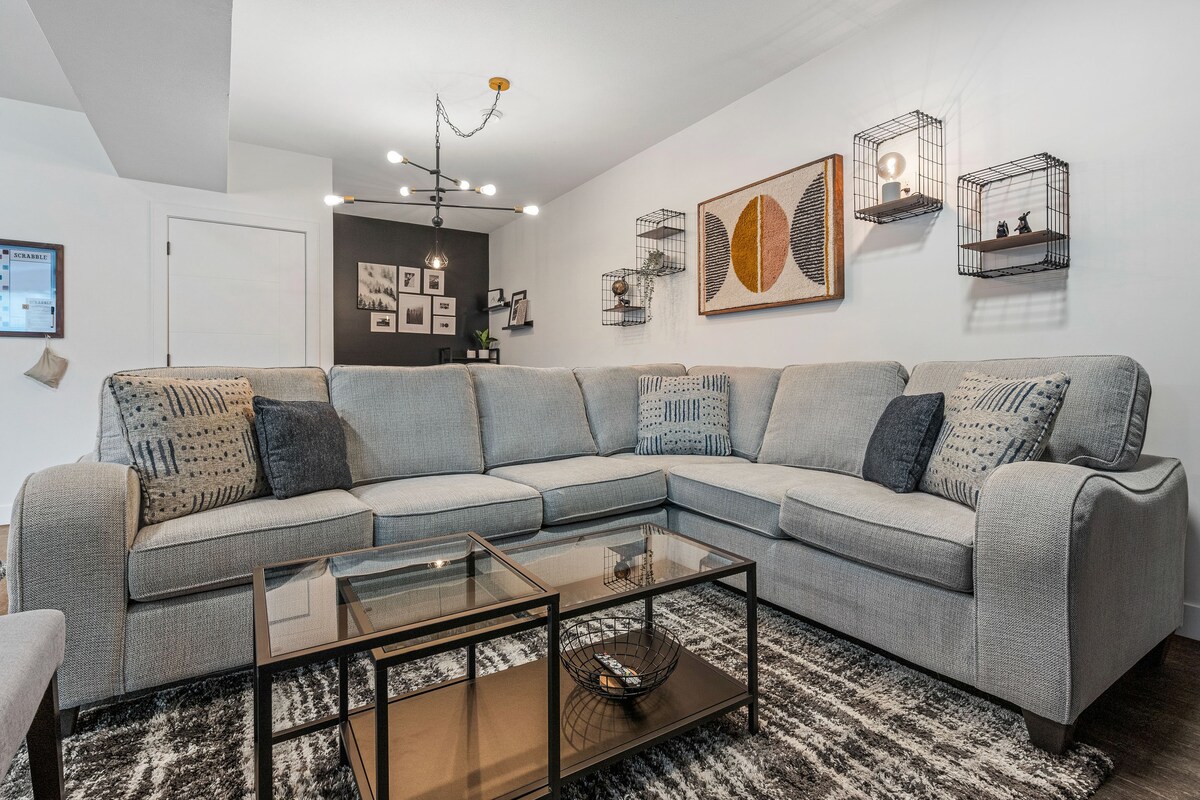 This cozy, modern above ground 1 bedroom & 1 bathroom basement suite is bright and spacious and offers everything you will need to make your stay as comfortable as possible. 70 inch TV w/ cable & Netflix, large sectional sofa with double pull out bed, Wifi, central air, in-suite laundry, quality linens with extra bedding. Lots of large windows which let in an abundance of natural light and a dedicated work space overlooking the backyard. Free parking. Private patio & smoking allowed outdoors.
