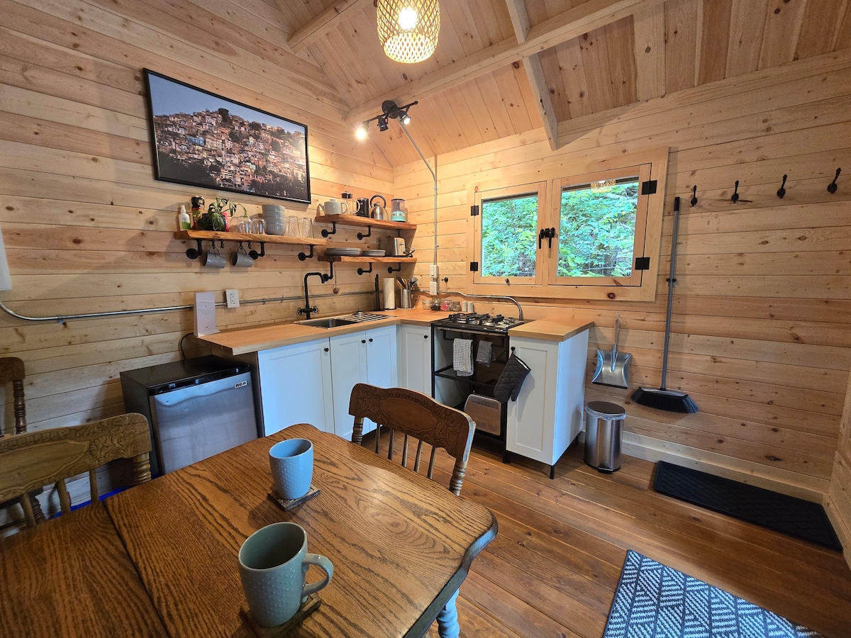 Come enjoy a cozy tiny home getaway with stunning views! The kitchen has all the basics you’ll need for cooking, and you’ll sleep like a dream on the super comfy queen Endy mattress in the loft. Unwind by your own private outdoor fire pit, or head out to explore the endless hiking and biking trails just steps away. Golf courses, wedding venues, restaurants, breweries, and great shopping are all just a short drive from the property. No TV , so please bring your own device to connect our our wifi.