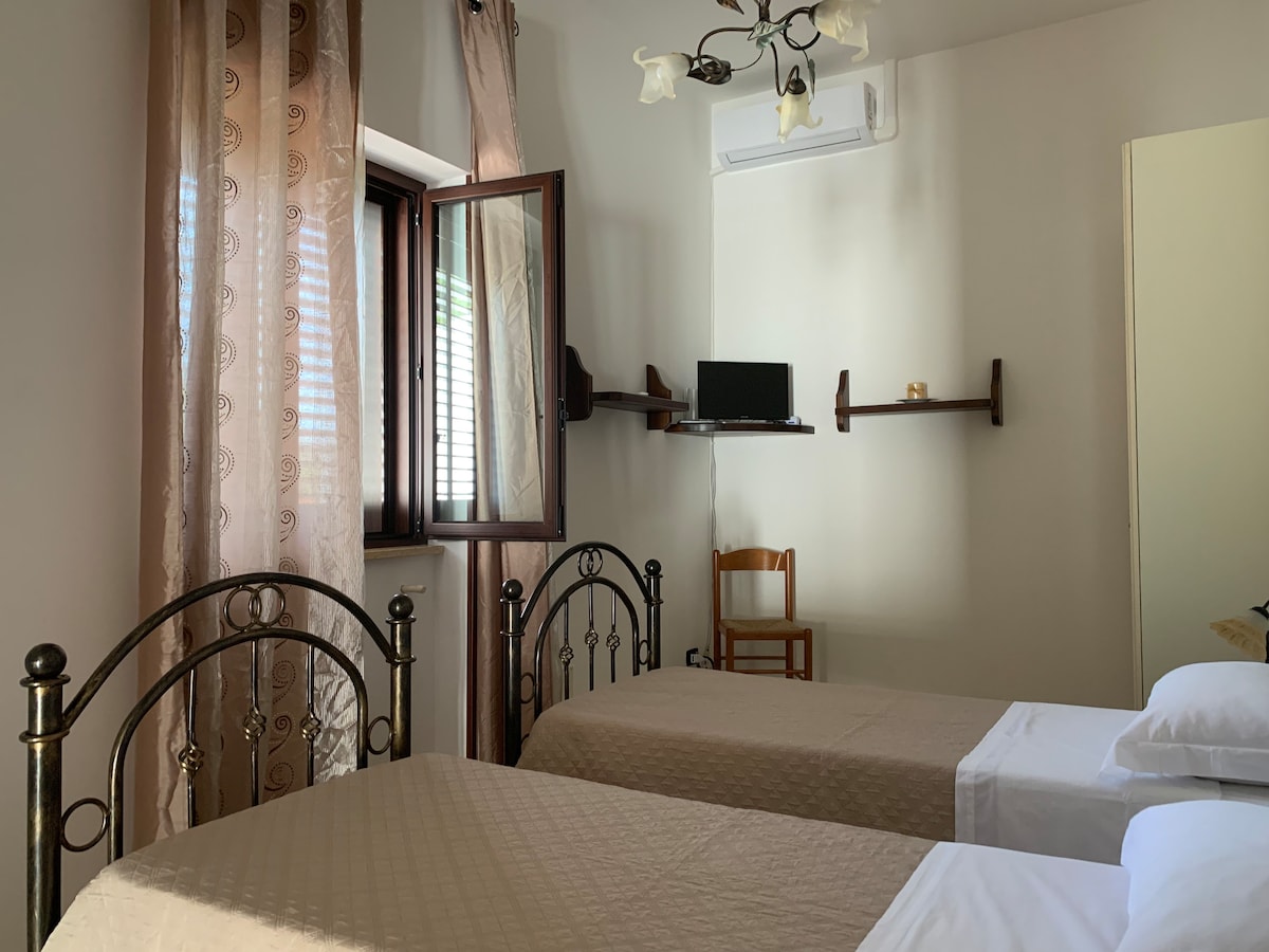 Appartamento bilocale composto da ampio soggiorno con angolo cottura attrezzato e comodo divano letto che si trasforma in due veri letti singoli, una camera da letto matrimoniale, ampio bagno, ampio patio privato di pertinenza attrezzato con tavolo esterno ombreggiato da un cannucciato, sedute e sdraio.
