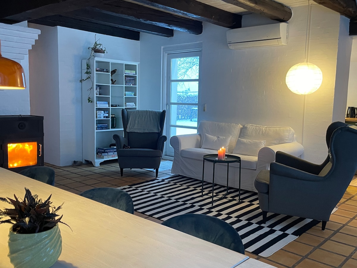 Nyd dage i denne rummelige og rolige bolig. Der er egen lukket have, med terrasse. To soveværelser med dobbeltsenge, hvor det ene er åbent og det andet har en skydedør. Ydermere er der en daybed i stueregi. Stue og køkken-alrum med brændeovn & varmepumpe Der er bad inkluderende vaskemaskine. Der forefindes to sæt dyner og hovedpuder. Det er tilladt at have hund med. Huset ligger ud til en lille vej