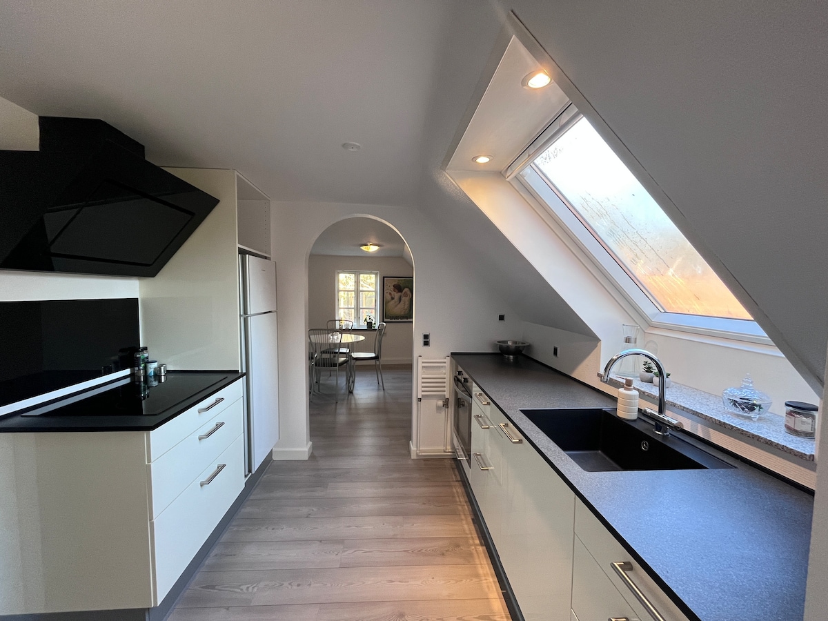 Hyggelig 2 værelses lejlighed 50 kvm. med skråvægge. I stille gade med gratis parkering. Indgang, entre, Soveværelse, stue, køkken og toilet og bad. Vi taler dansk, engelsk, tysk og tegnsprog. A cozy 2 bedroom apartment 50 sqm. with sloping walls in a quiet street with free parking. . We speak Danish, English, German and sign language.