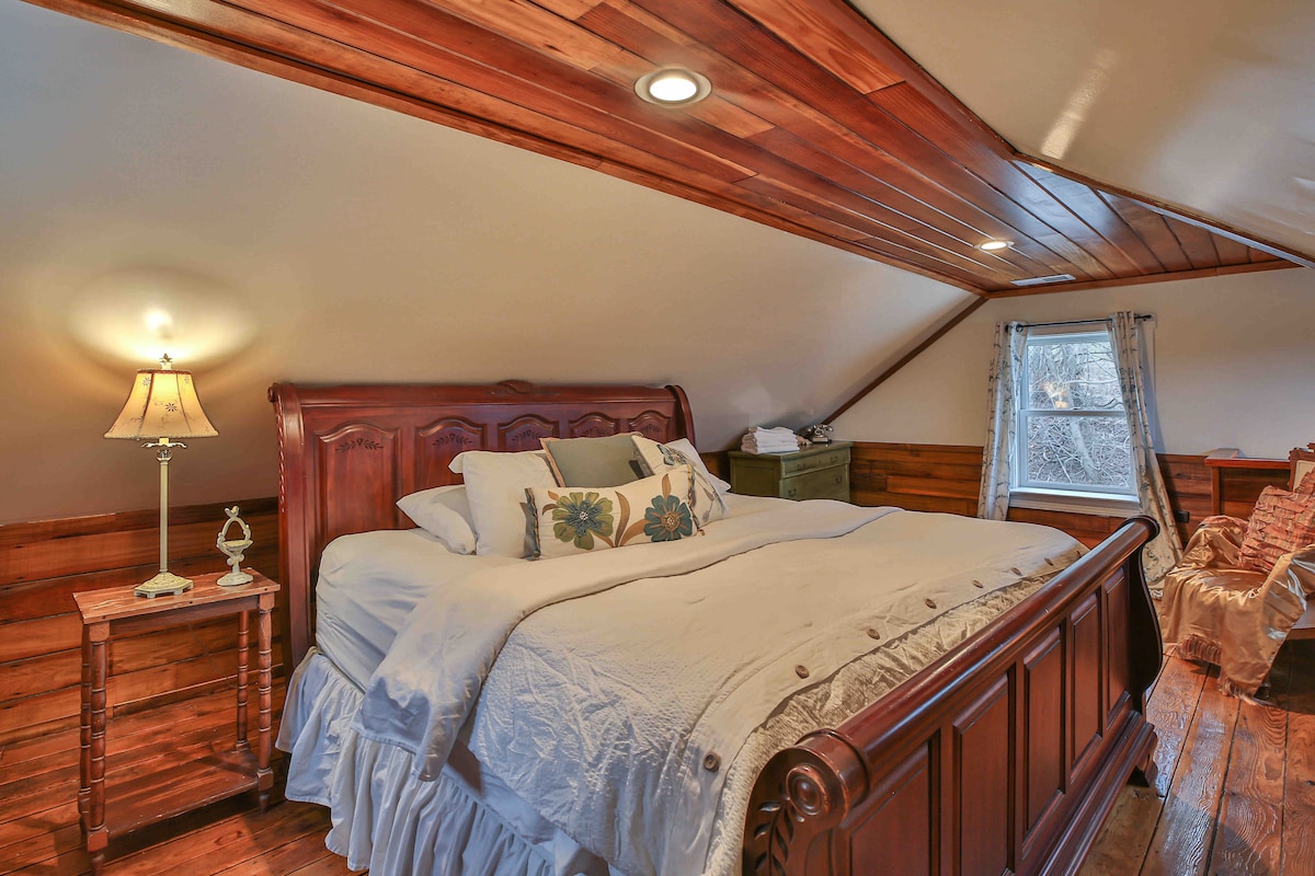 Sunnyside Farm offers a luxurious stay in a beautifully restored historic forge. You’ll be greeted by the farm’s delightful hosts, Jimmy and Dean, two friendly Potbelly pigs. Beautiful cows forage right outside your door. The Forge features exposed wooden beams, brick walls, and cozy furnishings. The interior is designed with plush bedding, a fully equipped kitchen, and spacious living reminiscent of yesteryear. Breweries, wineries and famous antique stores nearby offer entertainment.