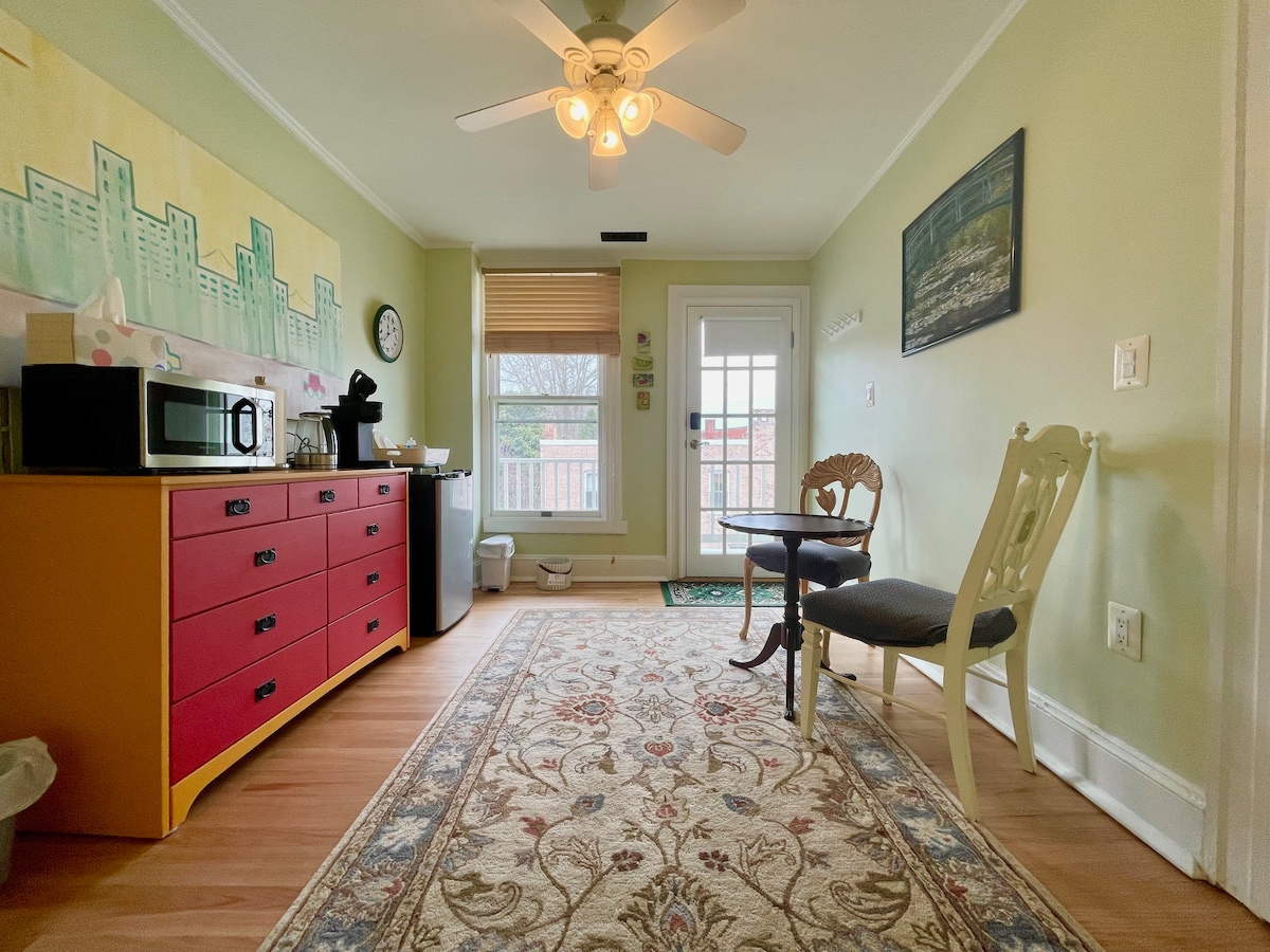 “Be our guest”...Our home is a historic 1882 3-story townhome in downtown Frederick. While we live on the bottom 2 levels, we’d love to welcome you to your own private apartment on the 3rd floor. “Oliver’s Retreat” is lovely and is comprised of 4 rooms...a family room, full kitchenette, full bathroom with shower, and a queen bedroom. The front door is shared, but once inside, the stairs (32 total) lead directly up to your completely private apartment. We have a keyless keypad for your privacy.