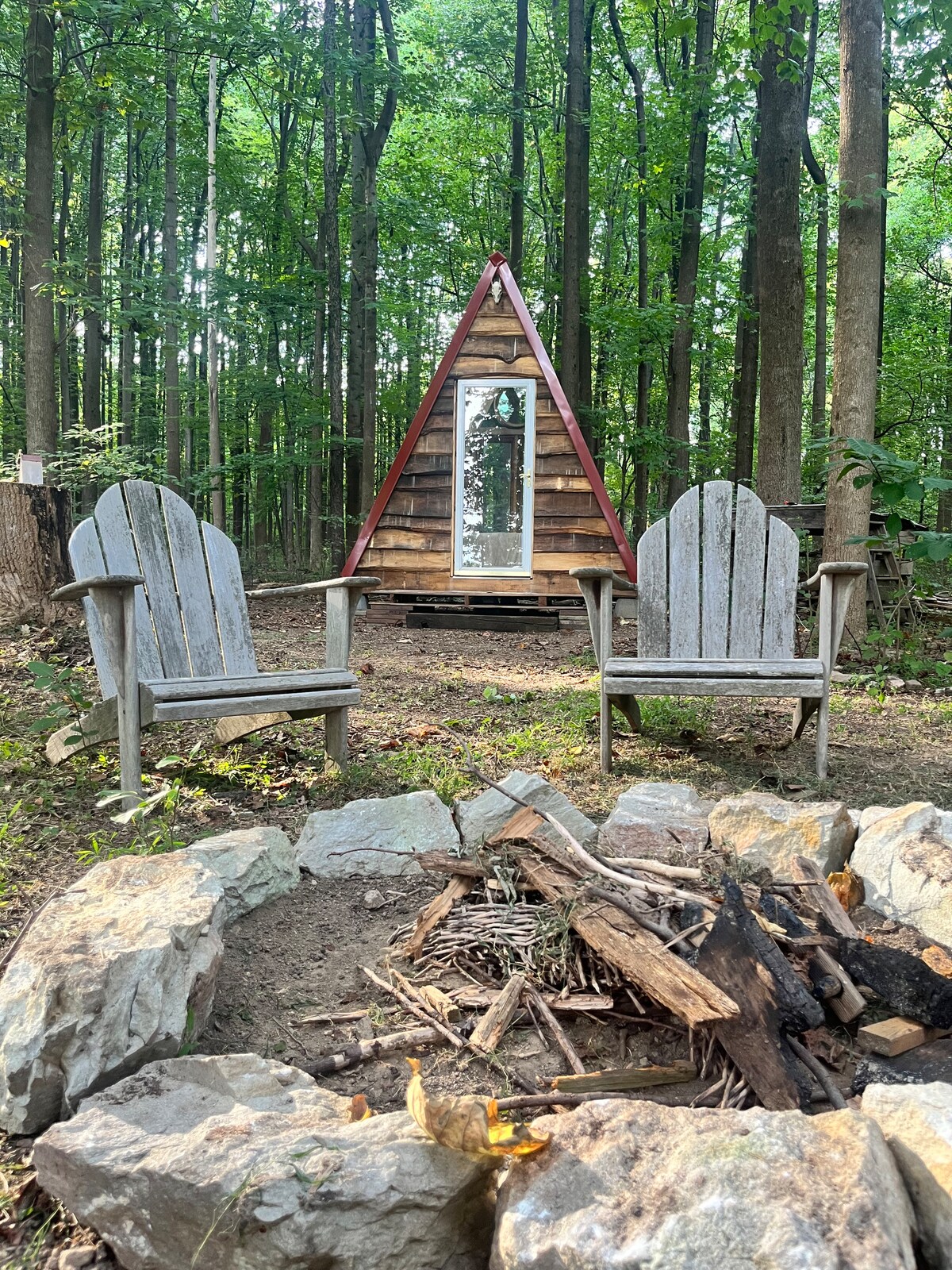 Beautiful, quiet woodland setting with a creek running through it, just 5 miles from downtown Frederick. Tucked away into the woods our tiny A-Frame has a comfortable queen bed(not an air mattress) for a rest and retreat fully immersed in the poplar woods. This is a camping style set up- so if you enjoy camping then this place is for you. No running water- but plenty of good clean mountain water available , no electricity, compost toilet. We do not allow dogs.