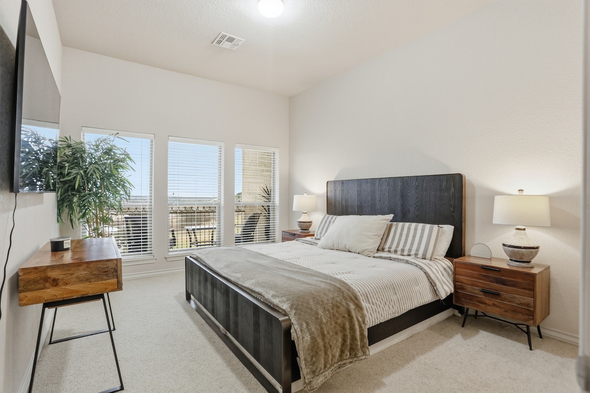 The "Pecan Villas" in Fredericksburg is a brand new, modern condo just minutes from Main Street in Fredericksburg with easy access to wineries, Luckenbach, Enchanted Rock, scenic Texas Hill Country drives, and more. This home features 2 master bedrooms with king-sized beds and ensuite bathrooms, a large gathering space with a fully-equipped kitchen, electric fireplace, and a private outdoor patio. I'd love to host you for your hill country getaway!
