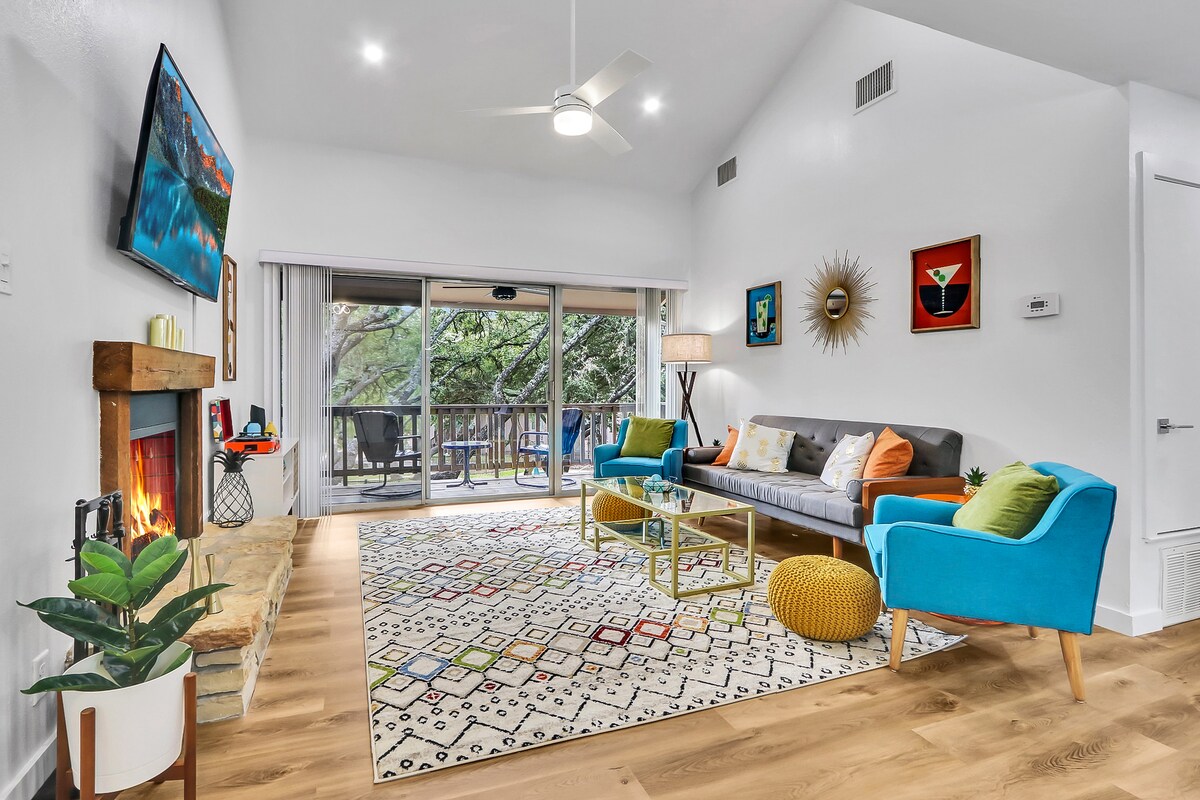 Here’s the RUNDOWN: - QUICK DRIVE to MAIN ST - 2 parking spots RIGHT OUTSIDE - Sleepy-time = Chill time - Bedroom w/ KING Serta i-Series mattress & 55"TV - Spacious living w/ 4K 70"TV, ATARI Console & KING pullout - Sign in to YOUR STREAMING services! - Grassy Indoor Nook w/ hammock (chill out!) - 2 private patio spaces (yes two!) w/ gas FIRE PIT - Dartboard & games - COTTON bedding - NEW SINGLE-LEVEL condo - EQUIPPED kitchen - Dining + bistro table, dual as office & island!