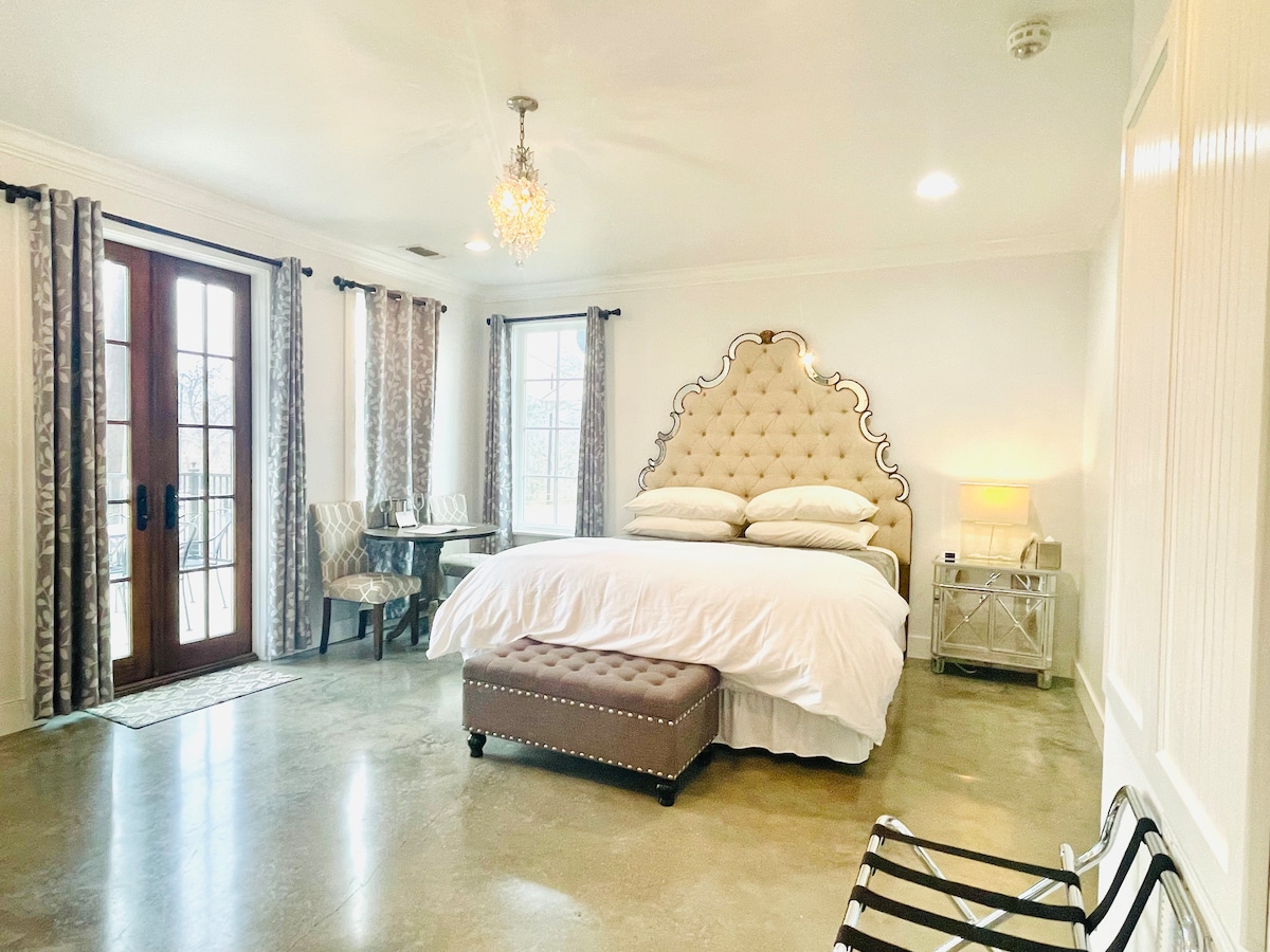 This King Suite is located at The Meyer Hotel. This boutique hotel has beautiful landscaped grounds that include a swimming pool, fish pond, and spectacular views of Cypress Creek that will make your stay a delight. Included in this room is, a Keurig coffee maker with k-cups, and microwave and mini-fridge, and a front porch with view. Please see the listing amenities. We are just down the street and an easy walk to downtown shops, restaurants, wine-tasting rooms and bars.