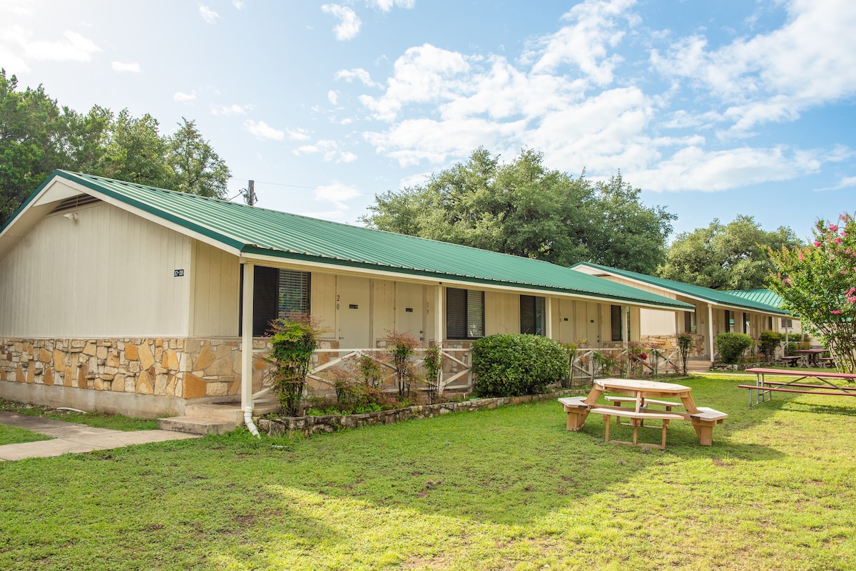 Our Lodge Rooms at Jellystone Park™ Hill Country offer comfort, convenience, and all the basics! This room sleeps up to 6 people and includes 2 queen beds and a twin bunk bed. The kitchenette (sink) includes a mini fridge, microwave, coffee pot, and 2-burner cook top. In addition, there is a full bathroom with a bathtub, AC/heat, cable TV, and a common patio area with picnic tables and charcoal grills.