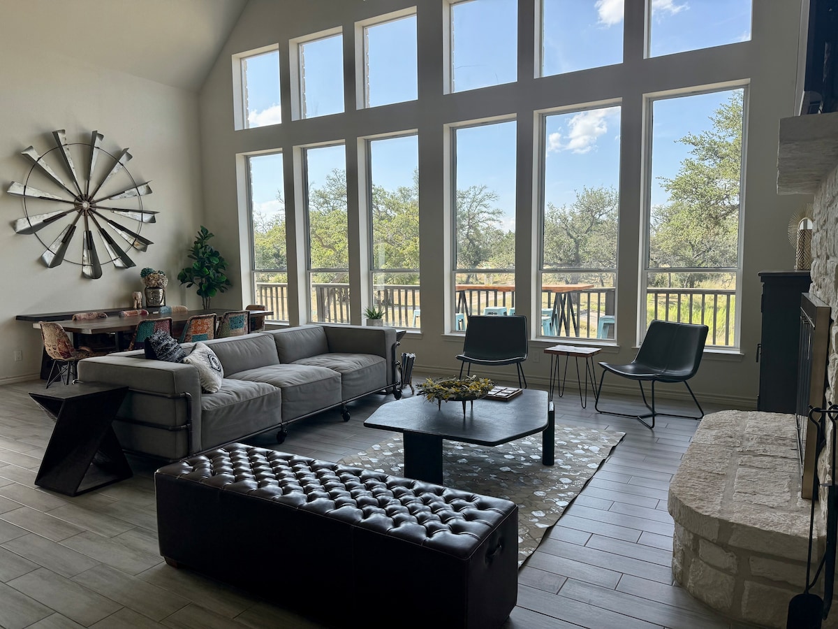 Private estate with ~1,500 feet of frontage on Little Blanco River (usually dry due to drought). Oversized windows look onto the ancient oak forest, with 20 acres of private hiking. Lavish pool & jacuzzi, large patio with fire pit and barbecue for outdoor dining under large tree canopy. 3 private bedrooms each with en-suite bathroom, plus bonus room (off the master room) with triple bunk for kids or adults. Additional pull out queen sofa bed and an extra bathroom. Quiet, exclusive and peaceful!