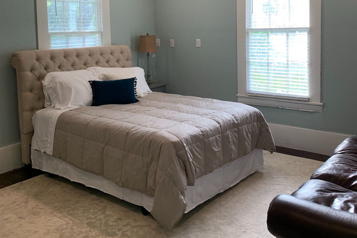 This is the one of four rooms at our Texas Comfort Haus. A Queen bed, large room and private bathroom are accessed from the side of our property. Single bedroom/bathroom combo with access doors from the exterior. We are only the THIRD OWNERS of this 115+ old historic home. It was used as a home, school and to house missionaries over the years. Now we share it. We LOVE its charm, and chose to not change many of those things. Yes, the floors are original, doors creak and insulation did not exist.