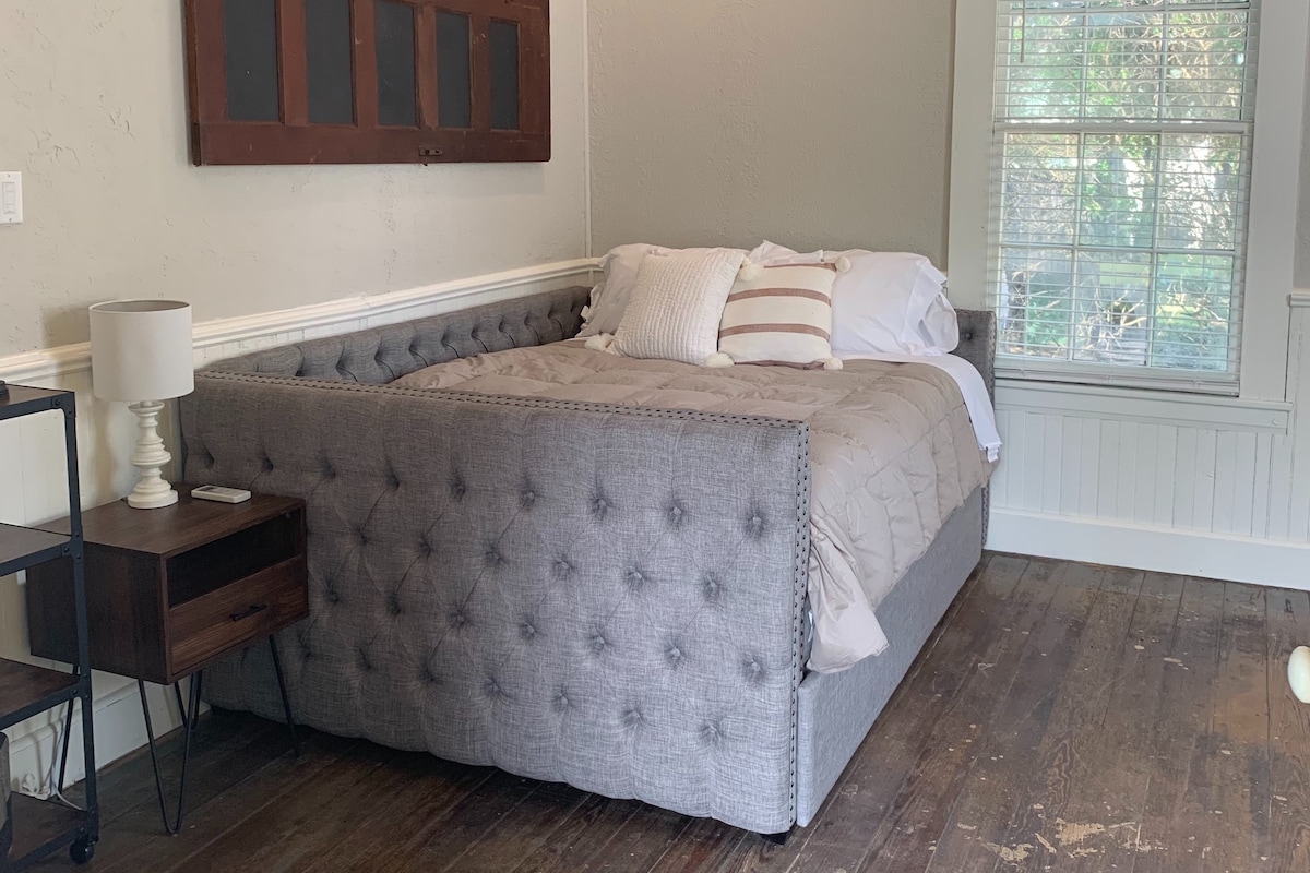 Seven minutes to Main St, FBG. Unpaved/private road/GREEN SPACE/HORSES/COWS LARGE RM SHARES A WALL W/OUR HOME. Since it’s a SHARED WALL it’s a BARGIN! No pets. PRIVATE entrance and PRIVATE bath. Furnished with oversized leather furniture and 2 TEMPERPIEDIC beds. Rustic style, antiques. Design for TWO couples/SM family, at approx 800 sqft. It’s huge. NO kitchen. NO Cooking. Coffee nook, frig, microwave, Culligan H2O 2 outdoor areas, one deck with lg shade tree & hammock. 2ND patio fire pit