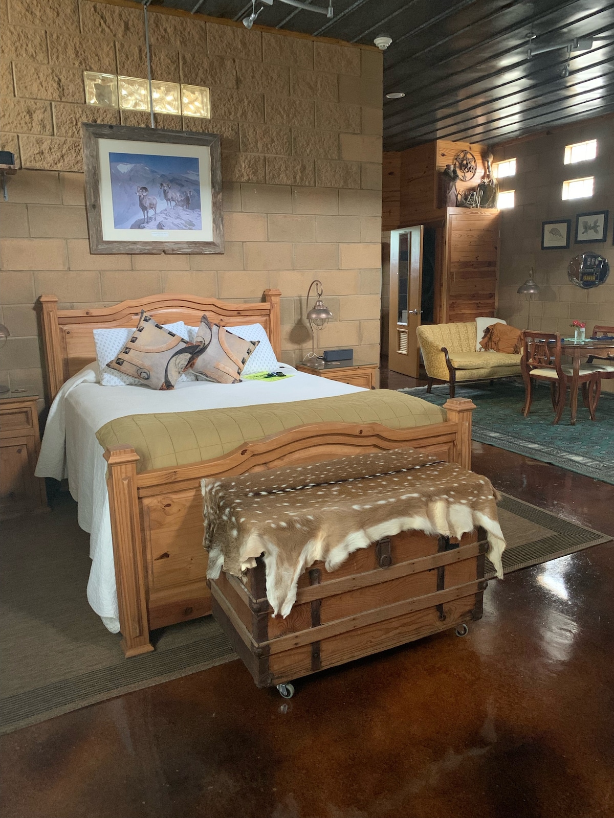 The suite has a view of the Cibolo Creek from the balcony for your enjoyment. It is a spacious 860 sq ft and a 5 minute walk to downtown Boerne and Main Plaza. The suite has a comfy King bed and accommodates a party of two. It sits on a large lot and has Coffee and Tea available in the room. If you are traveling with another couple there is a downstairs suite as well, that may be available for your stay. The Bunker Property owner on site.