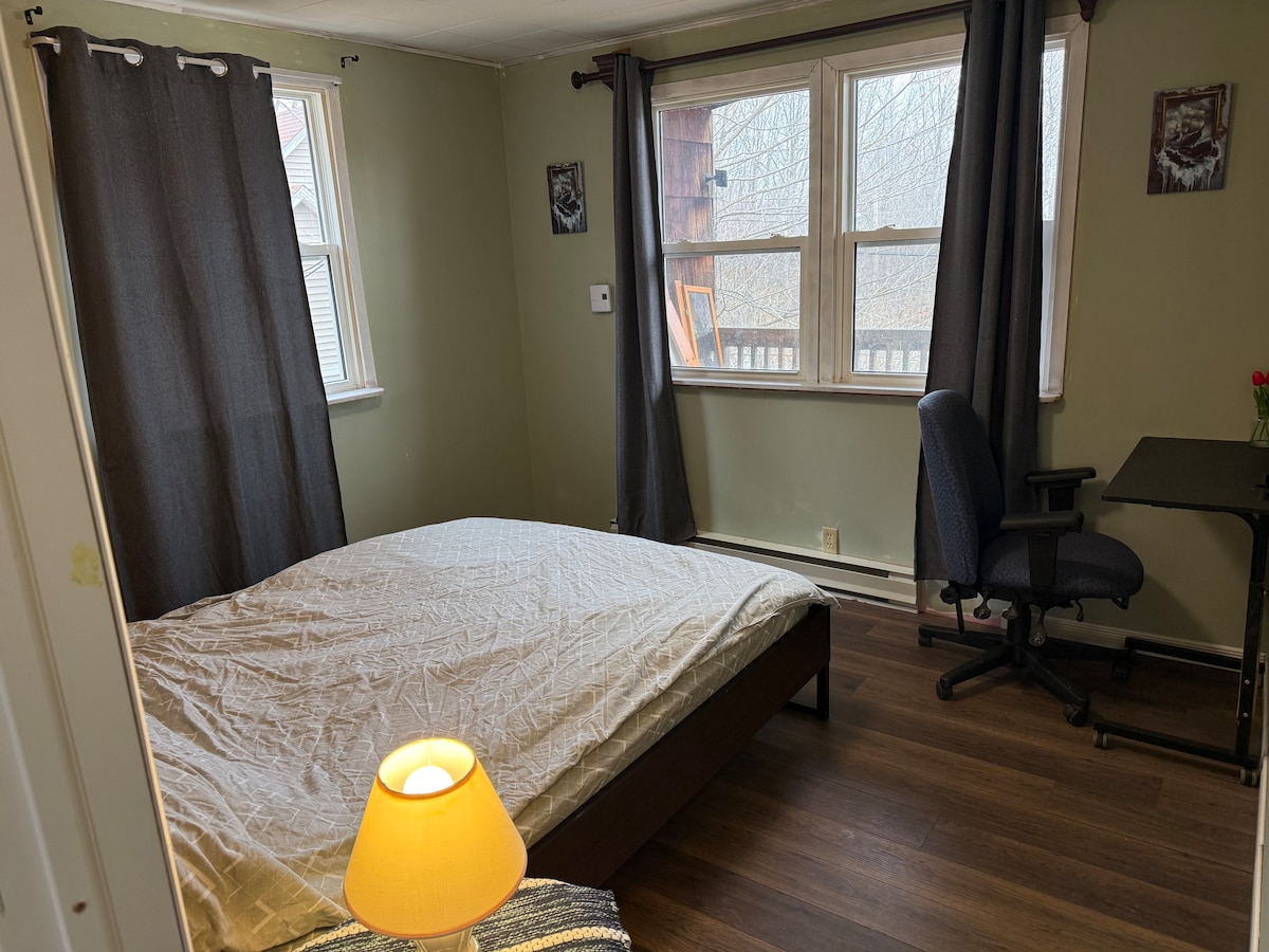 The Barrister Studio at The Red House Fredericton - ideal for short or longer stays. Park outside your private entry & walk directly into your lovely studio suite - no stairs. Plush queen bed with inviting white bedding, tranquil spa bath with heated floor, relaxing seating to enjoy TV/Netflix, kitchenette & workspace, guest-controlled HVAC. Bright, new, impeccably clean, safe, ultra comfortable. Downtown central to Hospice, restaurants, galleries, market, government, universities, stores.