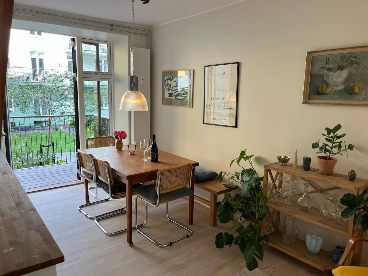 Old workers housing from 1899 in the hip and gentrified area Nørrebro, greatest neighborhood inthe world and great area for exploring Copenhagen on foot, by bike, bus Metro... 10 min. to center.Everything's only a three minute walk away - public transportation, nice cafés, wine-bars and beautiful parks as well. Mette's home is a sweet and restful place for a single person or a couple. Much "Danish hygge" here, colorful and tasty interior decoration.