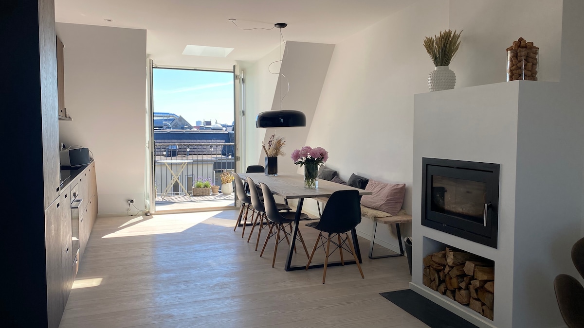 The 110sqm appartment has been fully renovated in a Nordic modern style and features heated Dinesen hardwood floors, Vola fixtures, an oak & granite kitchen and danish design furniture. The most stunning aspect is the 50sqm private rooftop with a heated bathtub overlooking Copenhagens skyline.