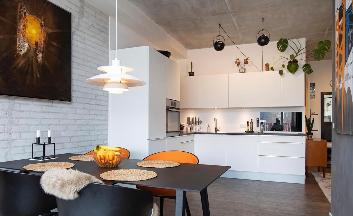 This apartment has a lovely calm and cozy vibe surrounded by amazing views of Carlsberg and Copenhagen to the sea. We love living with beautiful design objects and some completely natural elements in between. This is a place to be relaxed, creative, cooking or just contemplating the cityscapes. Located in the attractive old brewery site of Carlsberg filled with heritage buildings, squares, cafes and restaurants. Surrounded by beautiful parks, the hip Enghave Plads and the vibrant Vesterbro.