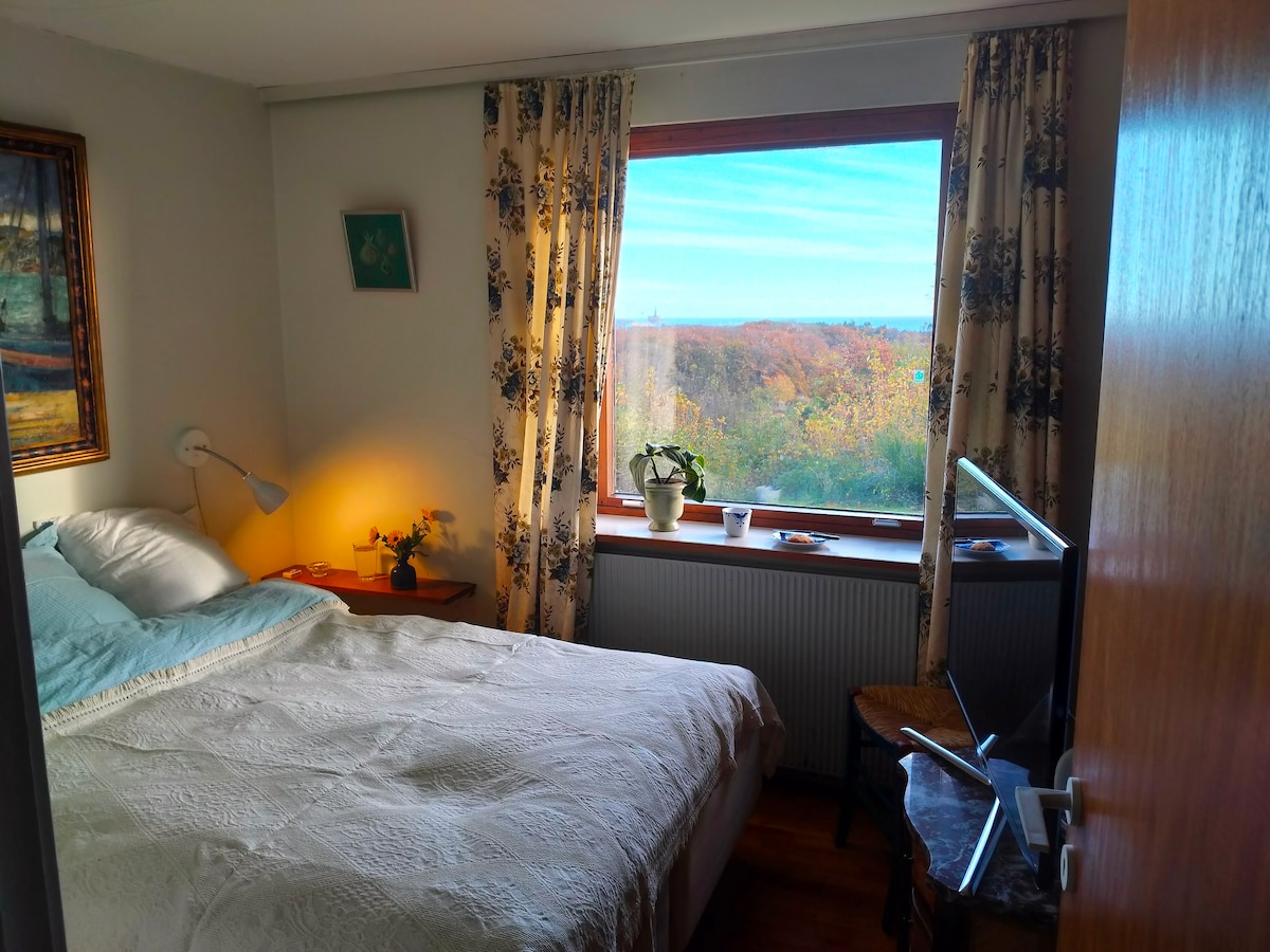Egen indgang og afdeleling i hus bestående af: et soveværelse, badeværelse og køkken med spiseplads samt gangarealer i Kilden lige uden for Frederikshavn. Egnet til én eller to voksne plus et spædbarn. Slap af i den enorme have med bålsted eller på terrassen og nyd roen og udsigten over hav, by og skov.