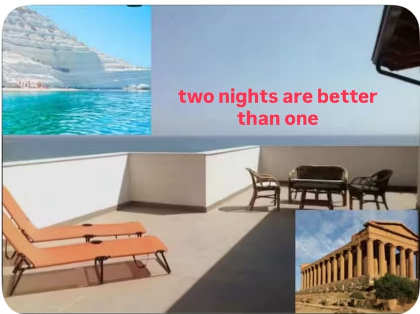 This house allows you to live moments of rest after an unforgettable day at the beach or at the “Valley of Temples”, as from there you can easily enjoy the enchanting parts of Agrigento. In fact, you can reach (on foot) “Via Atenea”, beating heart of the old town of Agrigento, full of shops, restaurants, bars and pubs. Moreover, a free parking is available near the house. The terrace of () is breathtaking and sea view; there it is possibile to have a good breakfast or also a candle light dinner.
