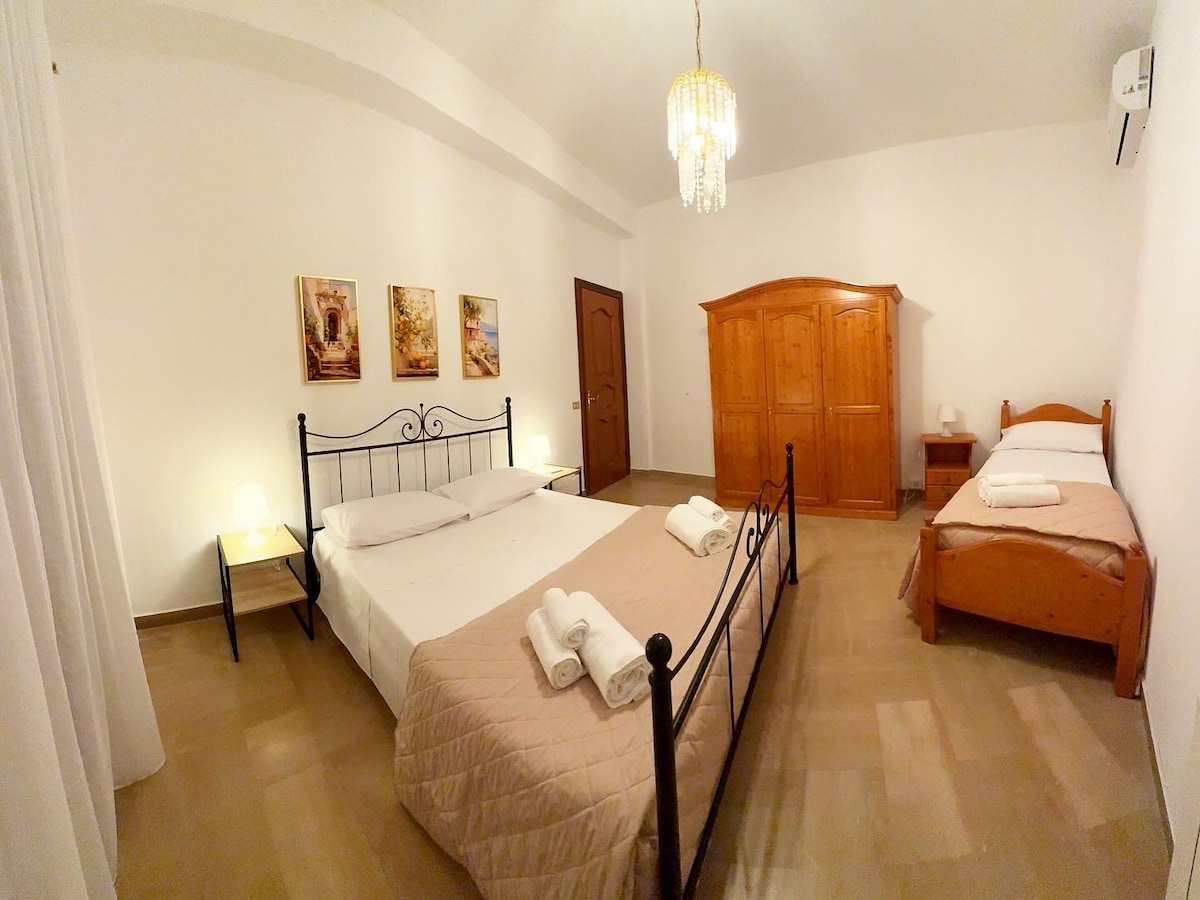 Benvenuti nel nostro appartamento al 2°piano. Vi si accede da una scala di marmo. Esso si sviluppa dalla cucina componibile con frigo, freezer e tavolo da pranzo e 4 sedie). A destra vi è il bagno con tutti i servizi igienici; su uno scalino ci sono bidet e doccia. A sinistra dell'ambiente cucina si accede ad una stanzetta con letto singolo e divano. Dalla stanzetta si entra nella grande stanza matrimoniale. Un grande balcone con tenda da sole offre una vista panoramica sulla città.