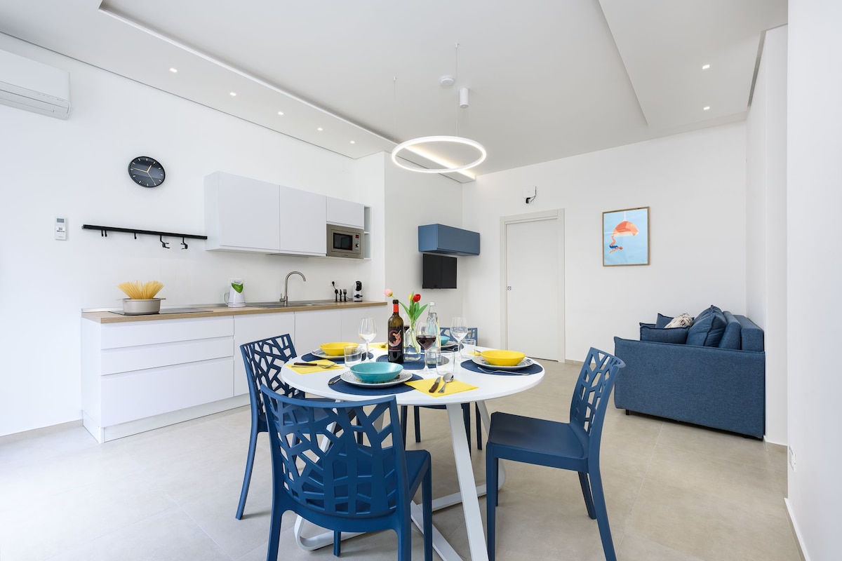 The Residence assembles innovation into comfort, conceiving apartments that, under the light of elegance, best embody functional design. A white and warm white masters the atmosphere, flooding our rooms with comfortable purity. The living area, never banal and superfluous, will captivate you with the careful style of interior design. The apartment has been designed to best accommodate a couple or a family with a child.