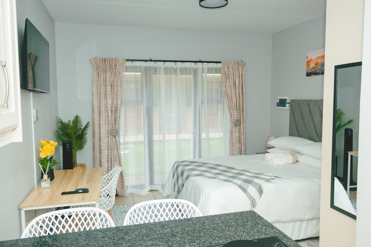 Spacious Urban Suite next to a peaceful green area with one open plan bedroom, kitchenette and bathroom (with a shower). Lovely outside space and seating area. Secure parking with CCTV cameras. Uncapped fibre internet and wifi with TV and Netflix. Close proximity to gym (1.7km) ; restaurants and bars. +- 3 km from N1. +-6 km from University of the Free State +- 7 km from Grey College +- 7 km from Mediclinic Hospital and Mimosa Mall