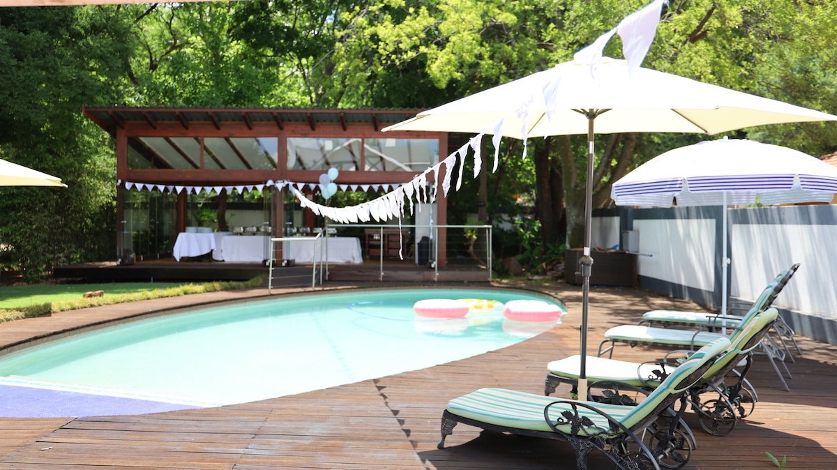Luxury Queen Room with Private Bathroom - Amenities include safe covered parking, uncapped Wi-Fi,air-conditioning, safe, TV (Netflix). Access to the living room (microwave and dining cutlery), garden, patio, glass gazebo, and a large swimming pool.