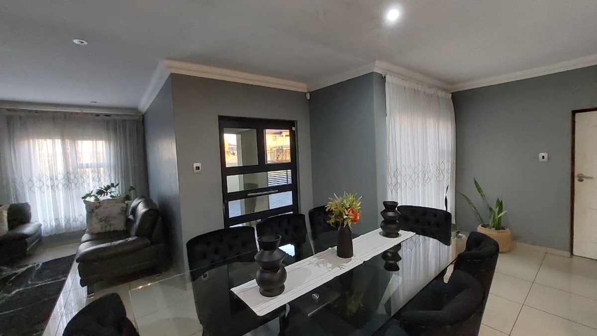 Fully self catering, furnished modern and stylish home, suitable for long and short visits. It is within walking distance of Seven Dams Conservancy (Hiking Valley), 2.5km from Northridge Mall, 2.2km from Preller Square which includes several great eateries and well known supermarket chains. Arrangements can be made for continental breakfast and braai packs as this townhouse includes gas and wood braai facilities. Pet friendly (By arrangement).