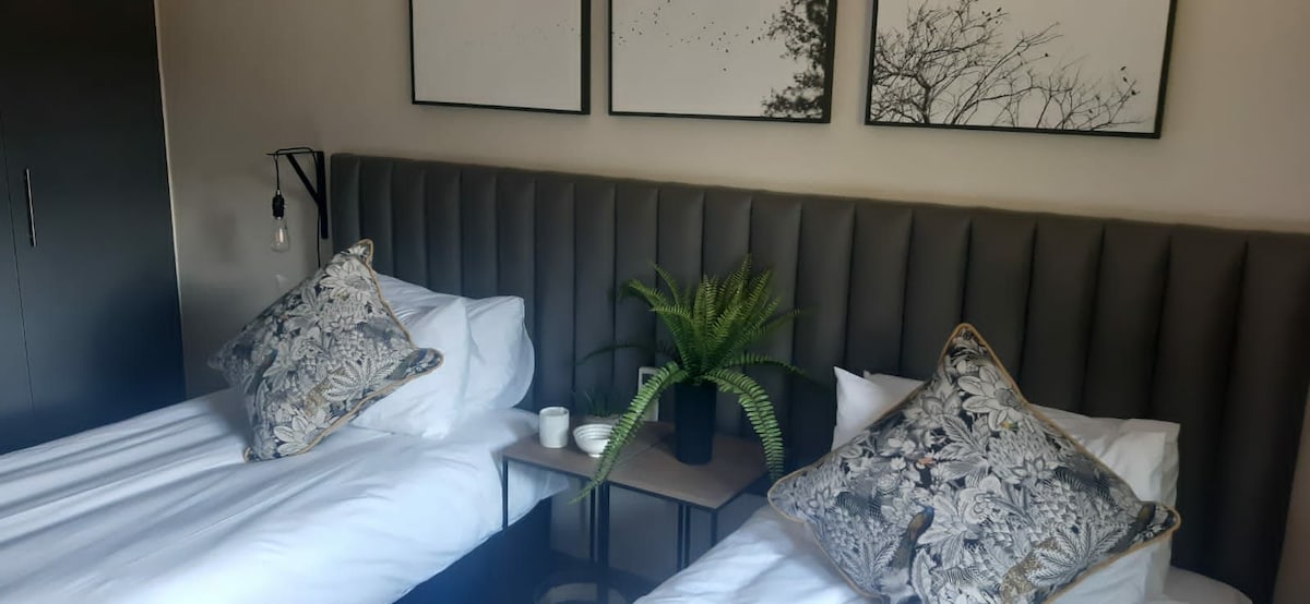 This unit comprises of 2 bedrooms and accommodates up to 4 guests at a time. 2 bedrooms with convertible bed sizes. Bathroom with a shower only, toilet and basin. The kitchen is fully equipped, the lounge has full DStv.