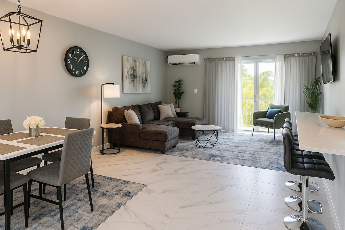 Modern condo with AC, king bed, and two smart TVs (55” & 58”) with cable/WiFi. Enjoy a private balcony with seating, full kitchen with dishwasher, pool access, and on-site laundry. Elevator in building for easy access. Perfect for comfort and convenience.