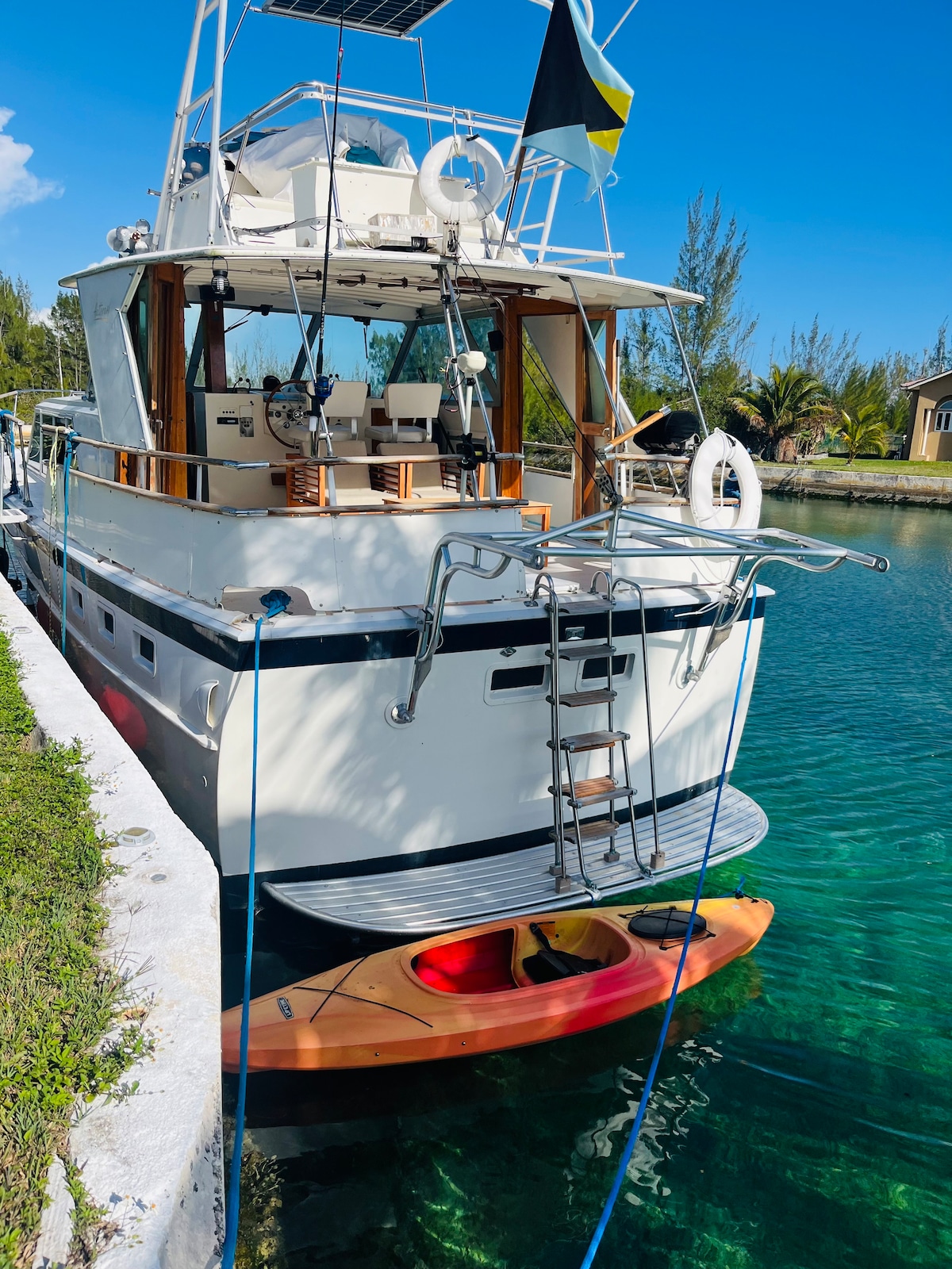 Welcome aboard our vintage 1971 Hatteras, where you can enjoy a unique stay and immerse yourself in the marine lifestyle on Grand Bahama Island. Sit back and relax on our docked 45ft boat right on the water and enjoy the peaceful surroundings of East End. She’s a classic, who’s been around the block, has charm and twin big Detroit diesel engines, great if you love the good old diesel smell! We have also hooked up with a local captain that can take you out for day to a local wildlife reserve.