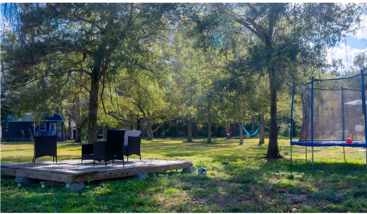 The Barracks @ Cedar Oaks Inn Step into history with this restored 1917 Ellington Air Force base cabin. Filled with antiques and original art, it blends timeless charm with comfort. Enjoy the back courtyard with outdoor kitchen, fireplace, water feature, and a unique garden bath featuring side-by-side clawfoot tubs and an open-air shower. Sip coffee or wine on the front porch while watching the chickens. Dog-friendly (30 lbs or less), this retreat is as quirky as it is relaxing.