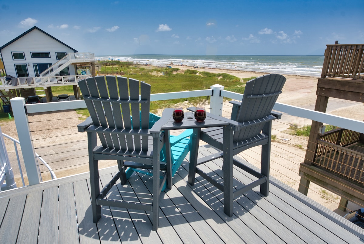 BEACHSIDE BLISS is a luxurious and stunning cottage located just a few steps from the beach, offering breathtaking panoramic views of the ocean. This luxury home is great for family gatherings, where you can enjoy the fresh ocean breeze and the soothing sound of waves. The balcony provides spectacular sunrise and sunset views and is ideal for viewing Galveston lights at night. Come spend some time here @ BEACHSIDE BLISS!