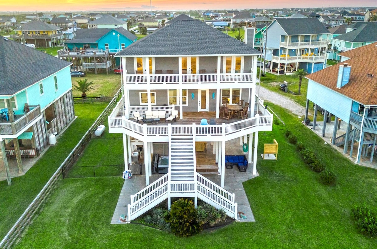 NEW Beachfront Construction! Truly a Unicorn:🦄 LOCATION, LUXURY, and So Nice to Have NEW! Located steps away from the best restaurants and beach in Surfside! Enjoy hammocks and games under the house. Climb the steps to an awesome shaded deck with views from San Luis Pass all the way to the Jetty! More than 180 degree unobstructed views. Bedrooms open to SunDeck and stargazing with fire 🔥 pit YouTube Beachfront Luxe for video $125 cleaning fee and only $75 total for up to 2 pets for whole stay!