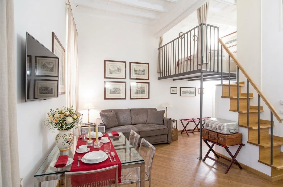Light the large stone fire and relax with a book in this elegant home overlooking Via dei Banchi Nuovi. Coffered ceilings cap cozy rooms in relaxing, neutral tones accented by designer furnishings and owner's original paintings. This charming fully renovated house is located in one of the most beautiful, ancient and vibrant area of the center of the Eternal City. We also like to offer eco-sustainable hospitality: we use electricity from renewable sources, organic products.