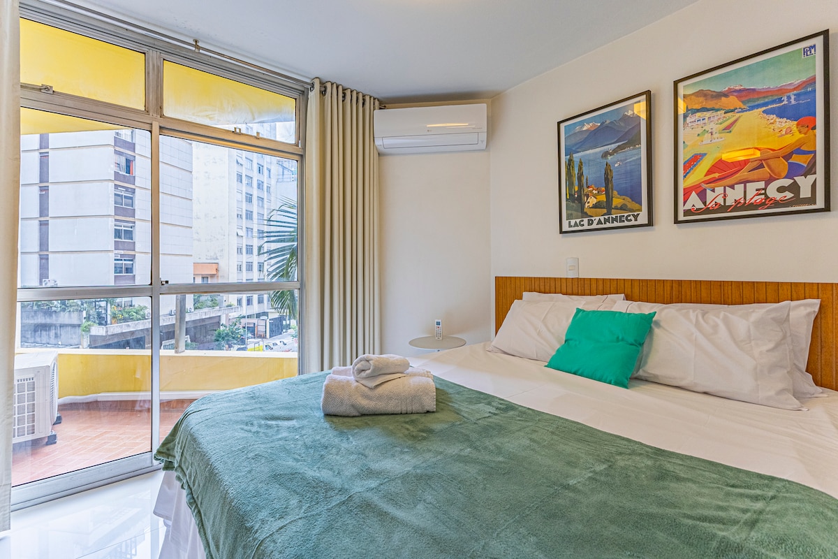 Stylish 50 m² apt. located at Bela Vista, has 24hr doorman. 2 bedrooms (only 1 with AC, and queen bed, the second one is quite small and can be used as an office, fitting a double-sized sofa-bed) and 1 bathroom. With amazing views from every window, it is a great place to work and relax. The private jet-tube at the balcony is a fantastic spot to enjoy the city views. Ideal for couples, professionals or small families looking for comfort, convenience, and one of the best views in the city.