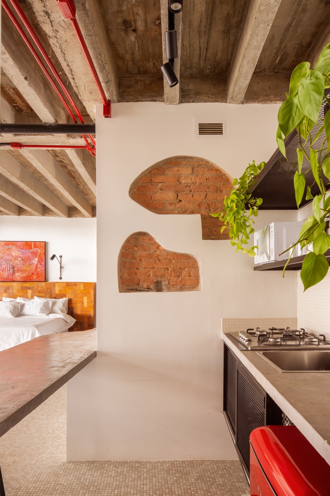 No topo do Copan, de frente para a Avenida Ipiranga, este estúdio de 44m² nos convida a flutuar sobre a paisagem de São Paulo. A sensação de leveza vem do piso em pastilhas, que, após a reforma, se estende por todo o interior do apartamento, criando continuidade visual e integração com o breeze característico da fachada norte.