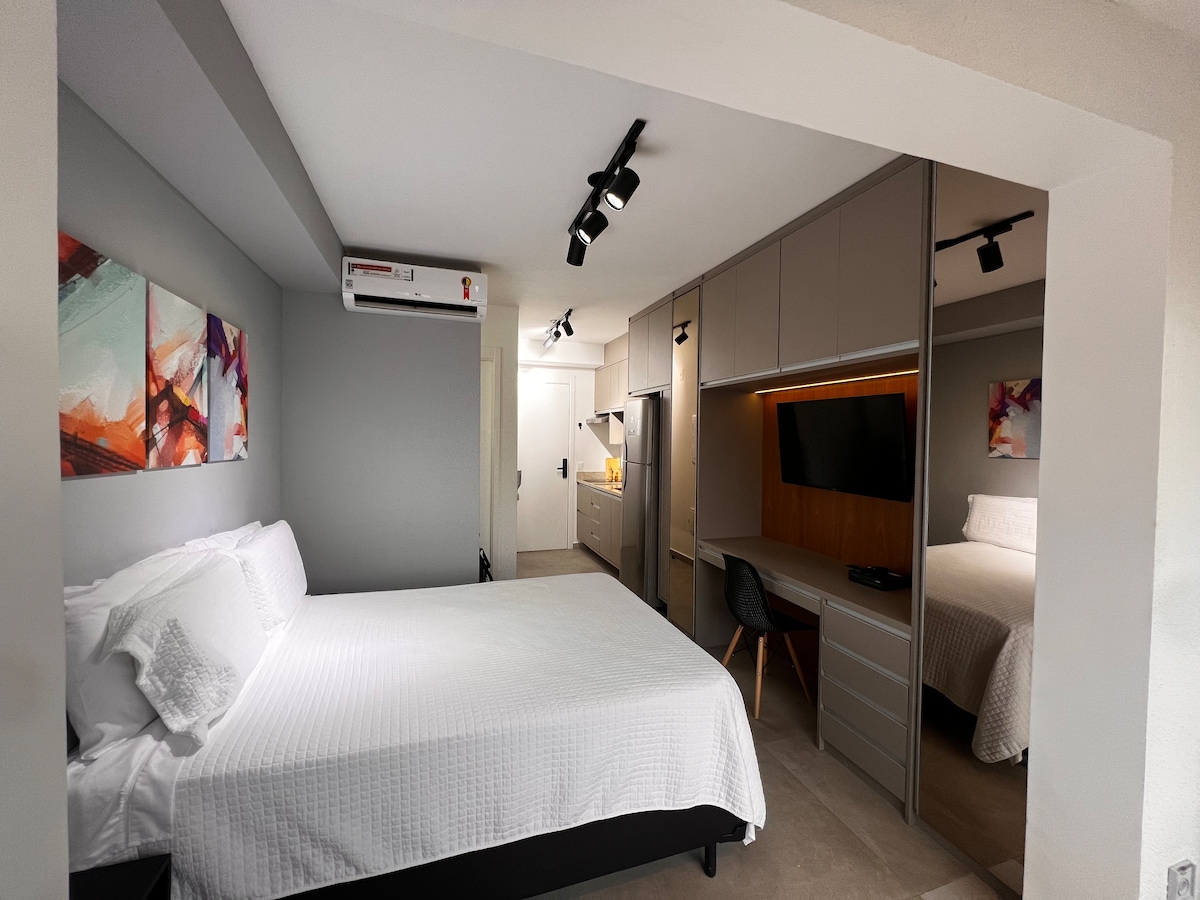 Apartamento completo com ar-condicionado no quarto, TV, cozinha compacta e varanda com vista incrível de São Paulo. Wi-Fi gratuito e limpeza diária. Prédio com recepção 24h, piscina, sauna, academia e jacuzzi coletiva. Estacionamento e café da manhã pagos à parte, servidos no restaurante do térreo. A uma quadra da Paulista, atrás do MASP, perto de tudo!