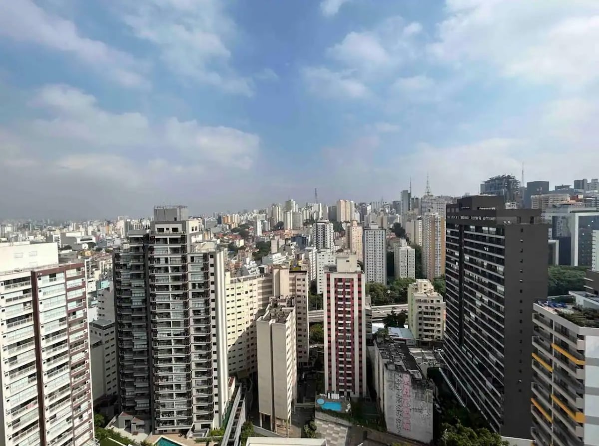 Work and relax with a 180° panoramic view on the 21st floor, just meters from Av. Paulista and Higienópolis-Mackenzie subway. Modern studio with air conditioning, ultra-fast Wi-Fi (461 Mbps), a comfortable workspace, and self check-in with a smart lock. In the building, enjoy a suspended Olympic pool, fully equipped gym, dry and steam saunas, laundry, and free parking.
