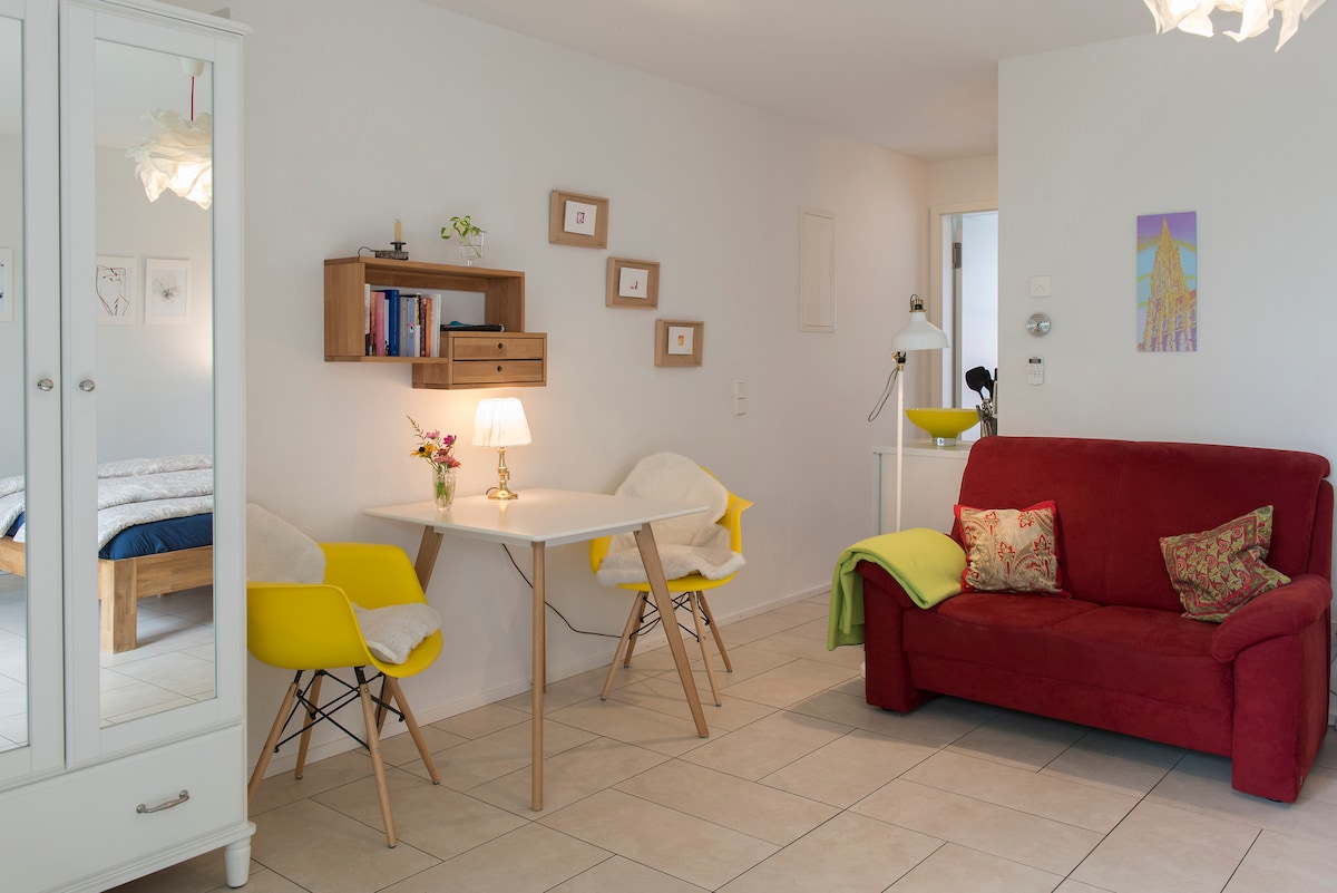 A bright and sunny apartment facing towards the Black Forest, this means there is a view of the Black Forest, we are 20 km away from the Black Forest Our apartment with a fully equipped kitchen and bathroom (& shower) has a spacious combined living & sleeping area. Located at the foot of the vineyards of Tuniberg; close to Freiburg centre, 12 km, in a small village. Convenient for day trips to Colmar, the Black Forest and Europa Park as well.