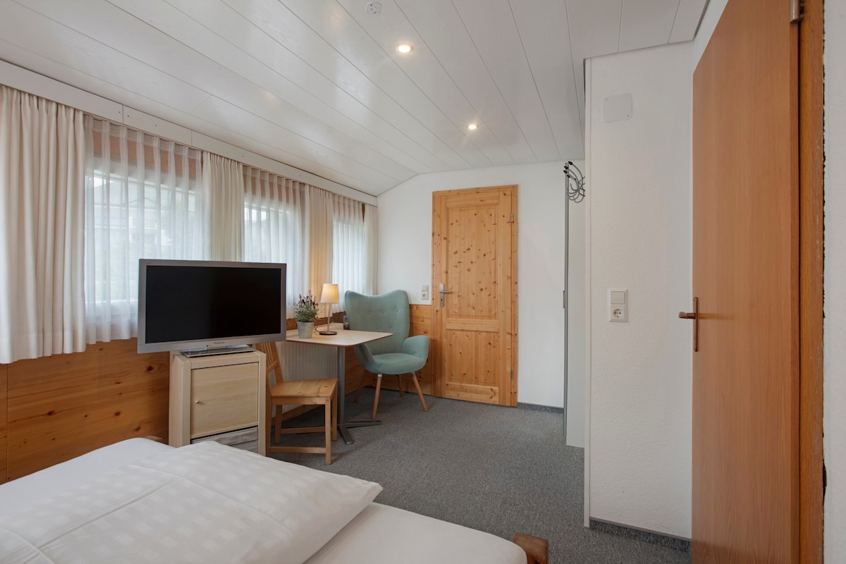 Room 16 offers 12 m² of space for one guest. It features a bedroom and a bathroom. The room offers a beautiful mountain view, and breakfast is included during your stay. Private amenities include Wi-Fi and a TV. We are pleased to welcome you to our establishment. Whether you are looking for a cozy holiday apartment or a comfortable room, you will find the ideal accommodation for your stay in the Black Forest with us.