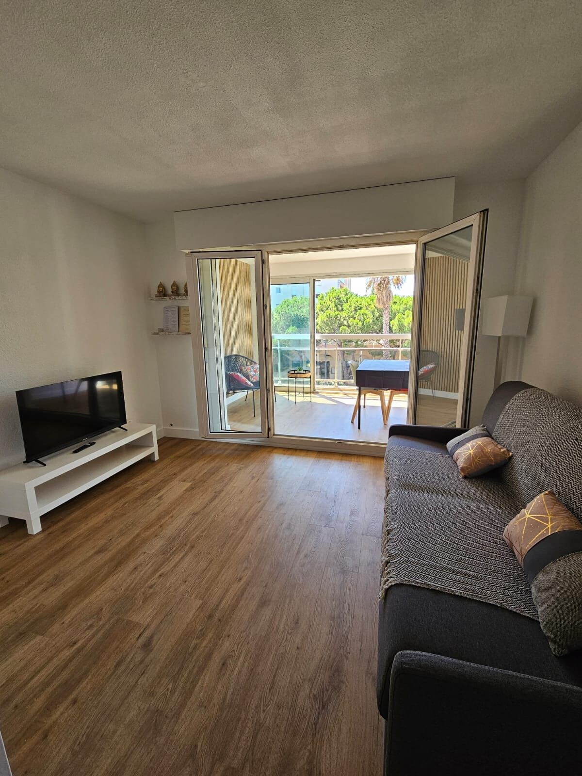 Nous avons aménagé notre Duplex de 42 m2 comme un petit Cabanon de bord de mer. Vue époustouflante au 3eme et dernier étage. Une chambre avec un lit de 160 x 200 sdb et WC séparés en haut. L espace du bas accueille une cuisine équipée, un canapé transformable en véritable lit de 160x200 Tout à pied. La gare de St Raphaël a 15 mn à pied. Aeroport 45 mn. Voyagez léger! Lits faits à l arrivée, draps de toilette et de plage à disposition ! Clim installée le 20 juin 2024