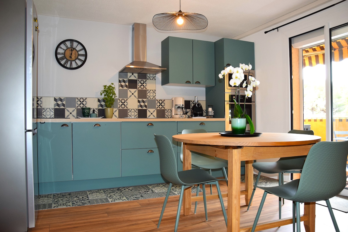[⭐️ Logement étoilé ⭐️] Appartement lumineux et fraichement rénové avec des matériaux et du mobilier de qualité. Proche de la mer, de la base nature, de la gare SNCF et du centre ville, son emplacement dans un quartier calme et résidentiel vous séduira. Jardin aux notes exotiques, pergola à lames orientables, possibilité de stationner votre voiture dans le jardin ou encore faire bronzette au soleil. Draps et serviettes inclus sans supplément, papier WC et café d'avance.