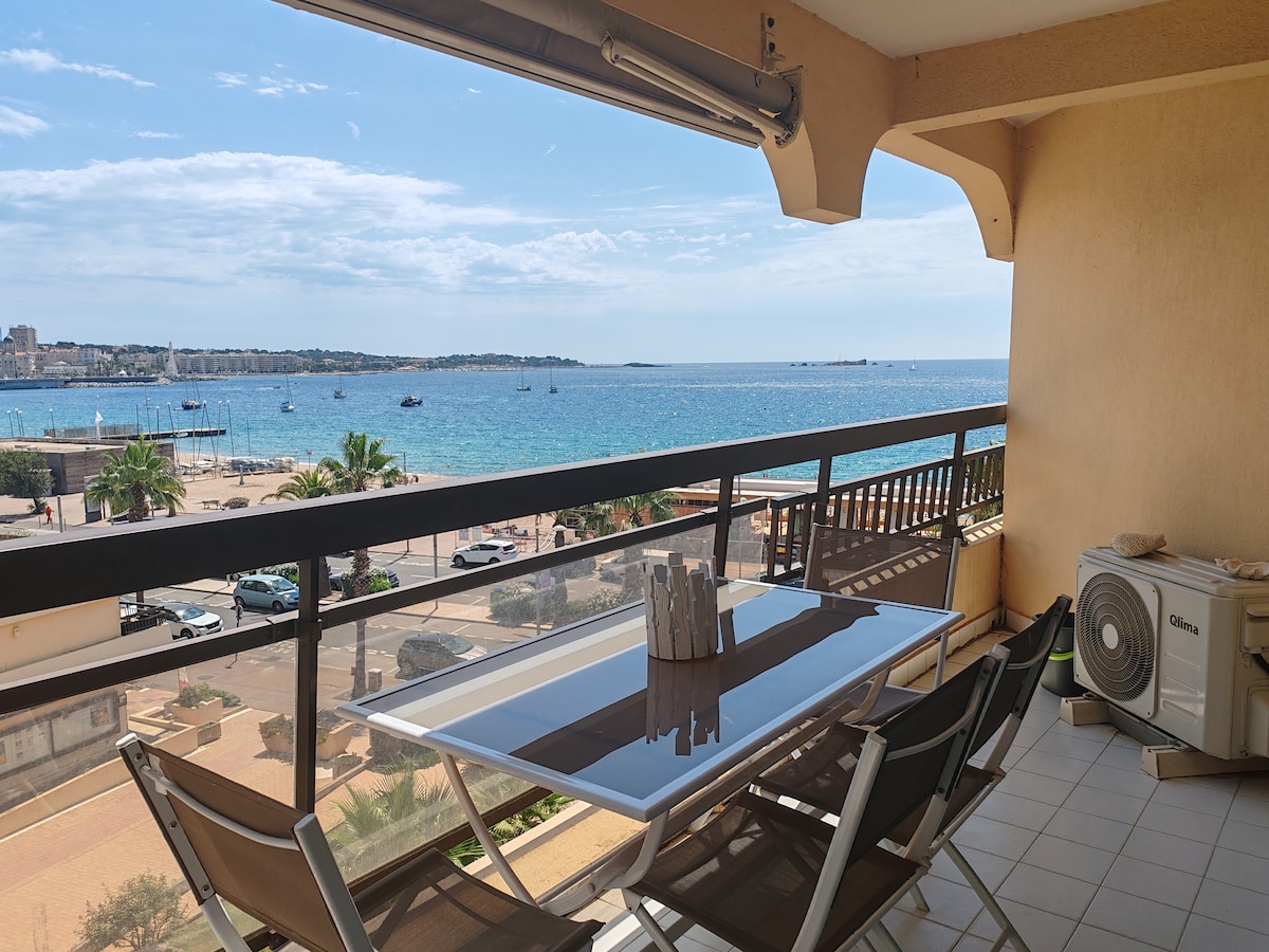Idéalement situé, tout à pied, plage, port et commerces à proximité immédiate. Appartement au 1er étage d'une résidence arborée au calme plein sud tout équipé (machine à laver, climatisation, four, TV, wifi, machine à café Tassimo, plancha...). Le logement se compose d'une pièce principale avec cuisine américaine, l'ensemble donnant sur un balcon de 10m2. 'Un coin nuit fermé avec 2 lits jumeaux, le salon dispose d'un canapé convertible 2 places. Salle de bain. Résidence sécurisée avec parking.