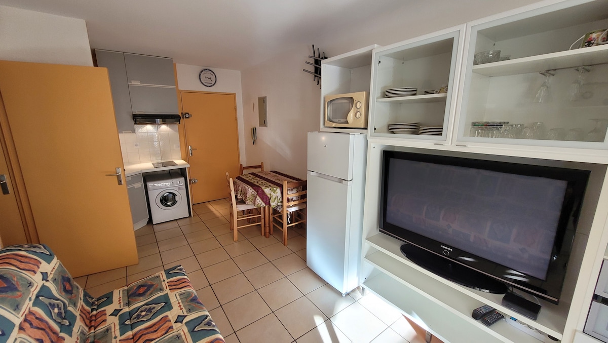 Night corner with double bed. Living room with sofa bed 140 cm. Bathroom with shower, washing machine. Kitchenette Wi fi. Climatisé. All linen is provided. Umbrella bed loan, baby bath and chair on request free of charge. Possibility to accommodate 2 more people on request. N tariff surcharge for children. It is located 700 m from the festival and beach palace. 500 m from the Cannes train station and 300 m from the Forville market and the Suquet parking private