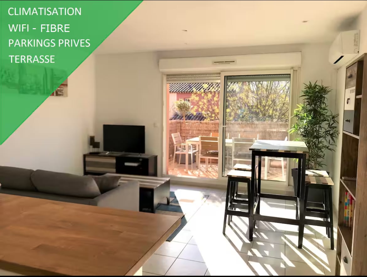 Profitez d'un logement climatisé, élégant - avec linge inclus, lit fait - et central (commerces, restaurants, mer ), au sein d'un jardin paysager et parking privé sécurisé ! - Suite-studio indépendante de 19 m², attenante à une villa. Vous profiterez d'une belle terrasse et salon extérieur. - Lit convertible Dunlopillo 160. - Espace snacking avec frigo, micro-ondes, vaisselle, barbecue (pas de cuisine ni plaques de cuisson ou four !) - En option : Lit BB, Hangar pour vélos, kite-surf...