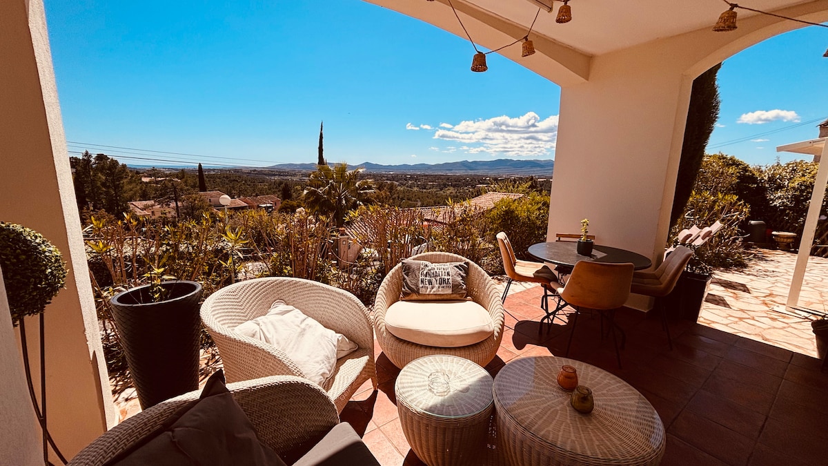 Just 10 minutes from the beaches and the city center of Mandelieu-la-Napoule, 30 minutes from Cannes, Villa Quercia is located in a secure domain and in an exceptional setting, on a magnificent plot of 2650 m². It offers a breathtaking view of the Esterel massif with, as a horizon line, the Mediterranean and the Lérins Islands. This luxury villa of 250 m², elegantly furnished, in Provencal style, facing south with private swimming pool awaits you for an unforgettable vacation