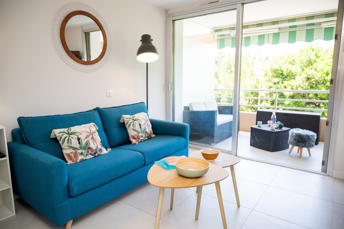 Agréable 2 pièces climatisé,rénové en 2022 de 30m2 situé à 600 m de la plage, 300 m de la Base Nature, 5 mn de port Fréjus, toutes commodités autour.Supermarché à 800m Premier étage sans ascenseur, profitez du calme, sans vis à vis, exposé plein sud, avec un balconnet,parking privatif dans la villa . Animaux admis gratuit Idéal pour couple ou petite famille. Caméra privée à l’extérieur,machine café Nespresso Linge fourni,produits d’entretien et papier toilette pour l’arrivée