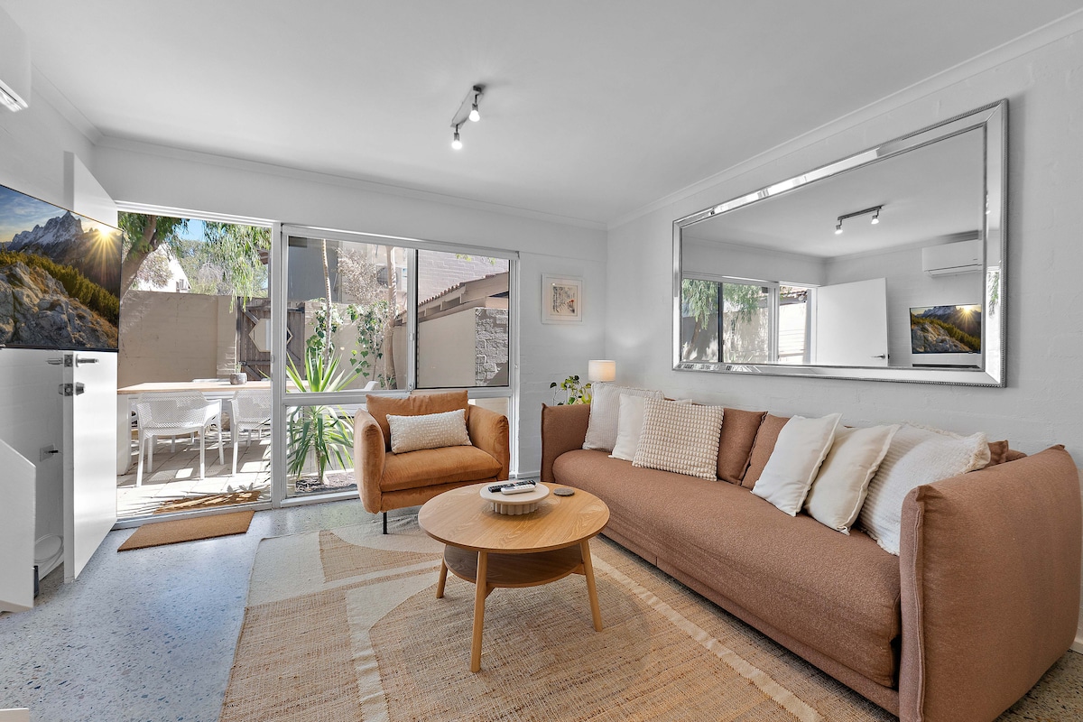 A stylish, secure townhouse close to cafes, shops and beach. Sleep in comfort in the queensize room with ensuite (yes, there's a bath) and enjoy the light airy kitchen and living, peaceful garden courtyard, and proximity to everything! There's a couple of push bikes available so you can explore like a local. The place is perfect for couples or solo travellers keen for a taste of Freo.