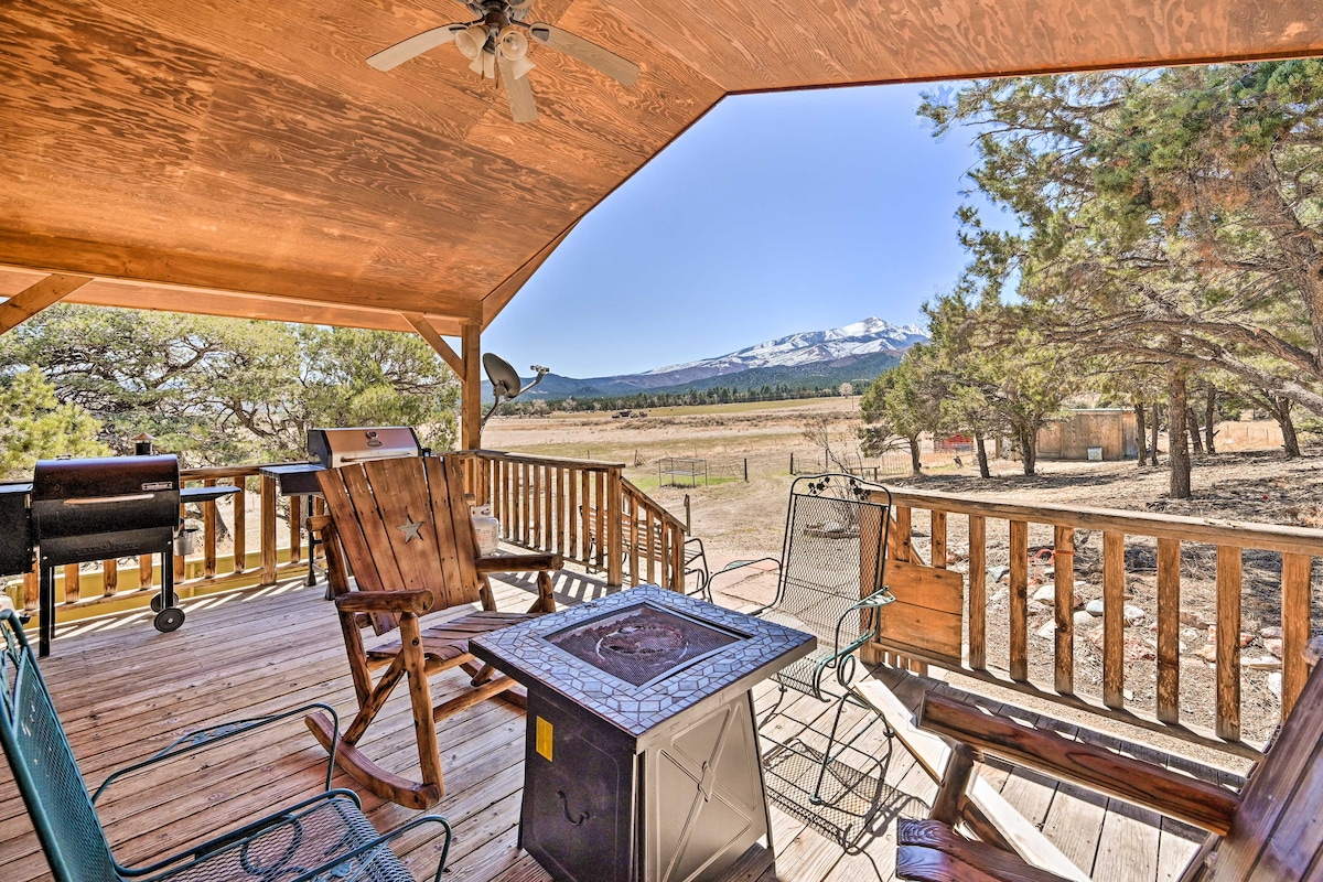 Bring the whole family to this cabin home! Nestled on 5 acres of serene, wooded land with stunning views of the Sangre de Cristo Mountain Range. Ideal for nature lovers: rock outcroppings, scenic hiking trails, star gazing at the Milky Way. Quiet and calm with fresh mtn air. Hummingbirds in the summer, deer and turkey . 4 person hot tub Horseshoe pit , exercise room for adults. Heated patio, picnic table large BBQ grill. Split system ac units in master bedroom, living room, and kitchen