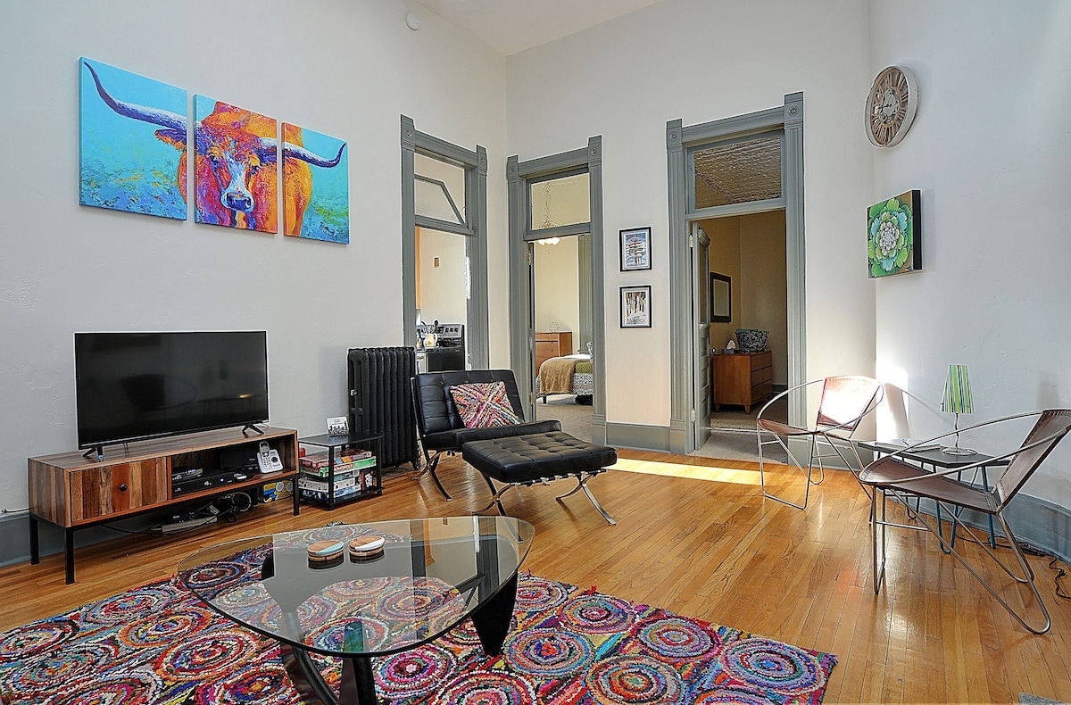 This condo is a 2 BR, 1 BA loft on the second floor of a Victorian storefront on F Street in historic downtown Salida, CO. It is furnished with fun, colorful mid-century decor including several local artists' work. Tall windows and a vintage skylight fill the place with natural light. The unit has a remodeled kitchen and bath, as well as a large shared deck with awesome mountain views in all directions. Walk to everything!